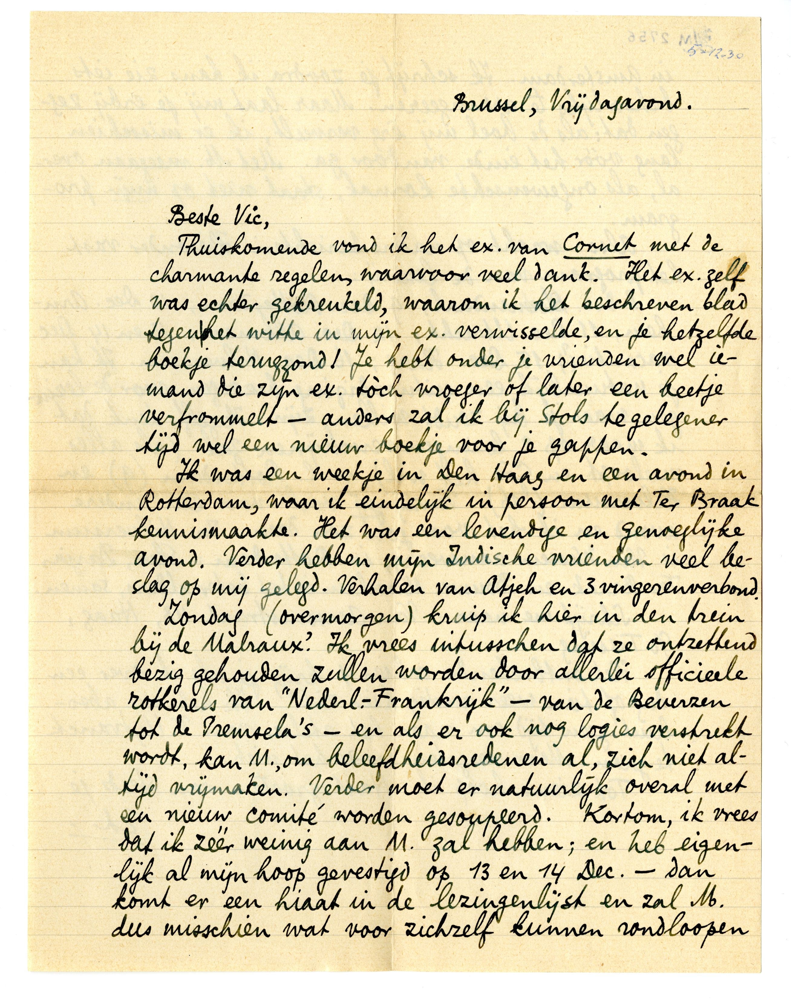 Thuiskomende vond ik het ex. van Cornet met de charmante regelen, waarvoor veel dank. Het ex. zelf was echter gekreukeld, waarom ik het beschreven blad tegen het witte in mijn ex. verwisselde, en je hetzelfde boekje terugzond! Je hebt onder je vrienden wel iemand die zijn ex. tóch vroeger of later een beetje verfrommelt - anders zal ik bij Stols te gelegener tijd wel een nieuw boekje voor je gappen.