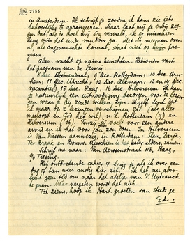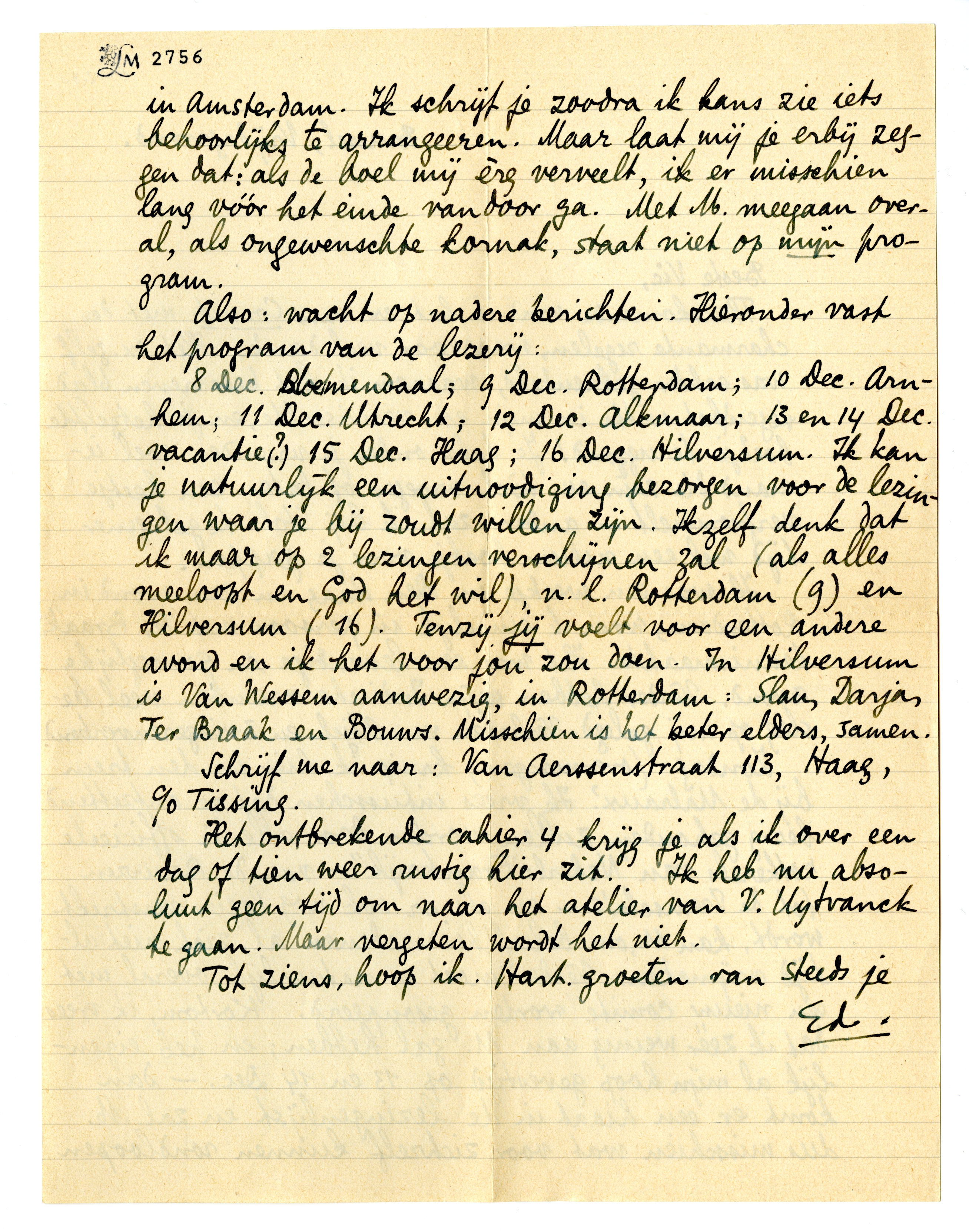 8 Dec. Bloemendaal; 9 Dec. Rotterdam; 10 Dec. Arnhem; 11 Dec. Utrecht; 12 Dec. Alkmaar; 13 en 14 Dec. vacantie (?) 15 Dec. Haag; 16 Dec. Hilversum. Ik kan je natuurlijk een uitnoodiging bezorgen voor de lezingen waar je bij zoudt willen zijn. Ikzelf denk dat ik maar op 2 lezingen verschijnen zal (als alles meeloopt en God het wil), n.l. Rotterdam (9) en Hilversum (16). Tenzij jij voelt voor een andere avond en ik het voor jou zou doen. In Hilversum is Van Wessem aanwezig, in Rotterdam: Slau, Darja, Ter Braak en Bouws. Misschien is het beter elders, samen.