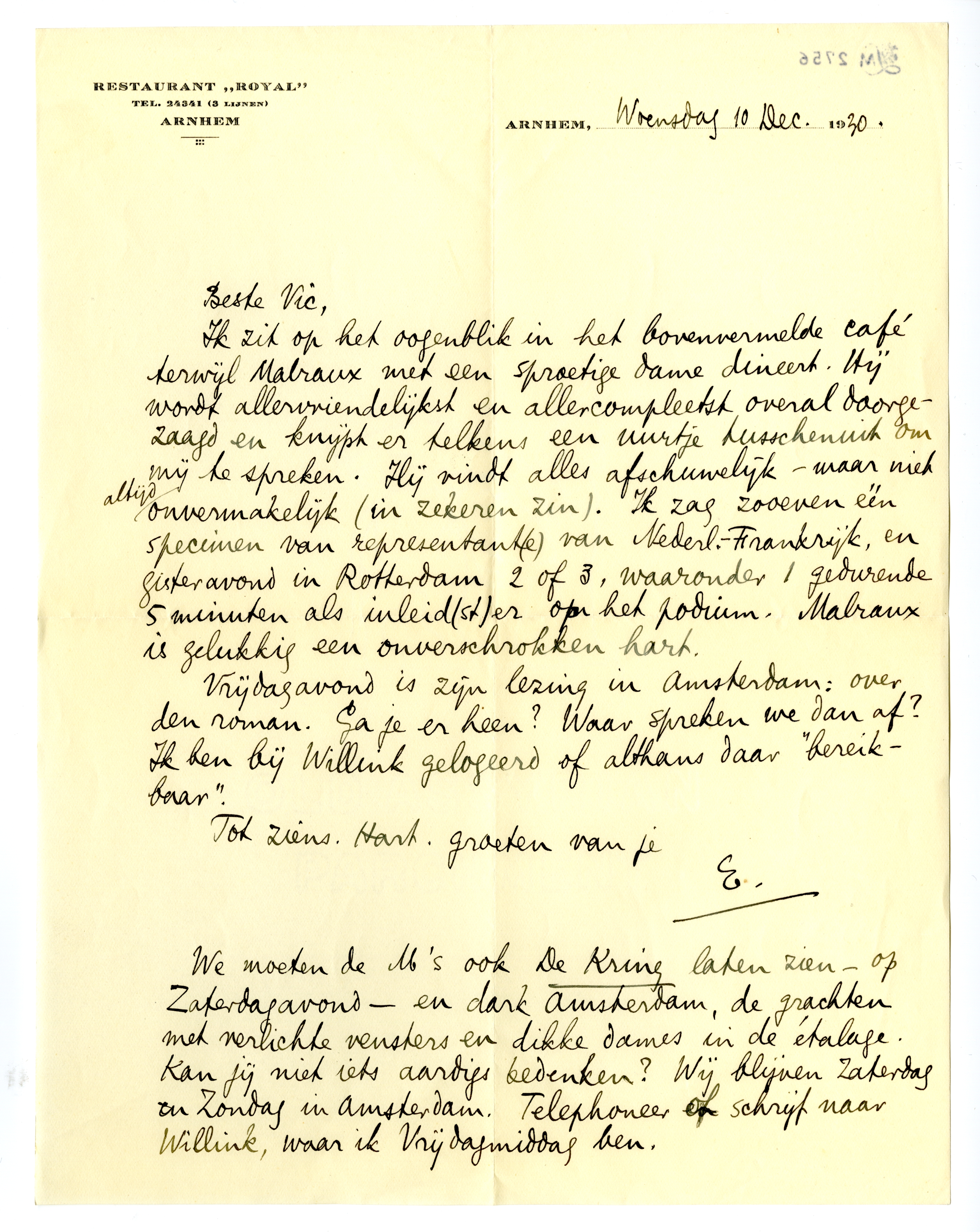 Ik zit op het oogenblik in het bovenvermelde café terwijl Malraux met een sproetige dame dineert. Hij wordt allervriendelijkst en allercompleetst overal doorgezaagd en knijpt er telkens een uurtje tusschenuit om mij te spreken. Hij vindt alles afschuwelijk - maar niet altijd onvermakelijk (in zekeren zin). Ik zag zooeven één specimen van representant(e) van Nederl.-Frankrijk, en gisteravond in Rotterdam 2 of 3, waaronder 1 gedurende 5 minuten als inleid(st)er op het podium. Malraux is gelukkig een onverschrokken hart.