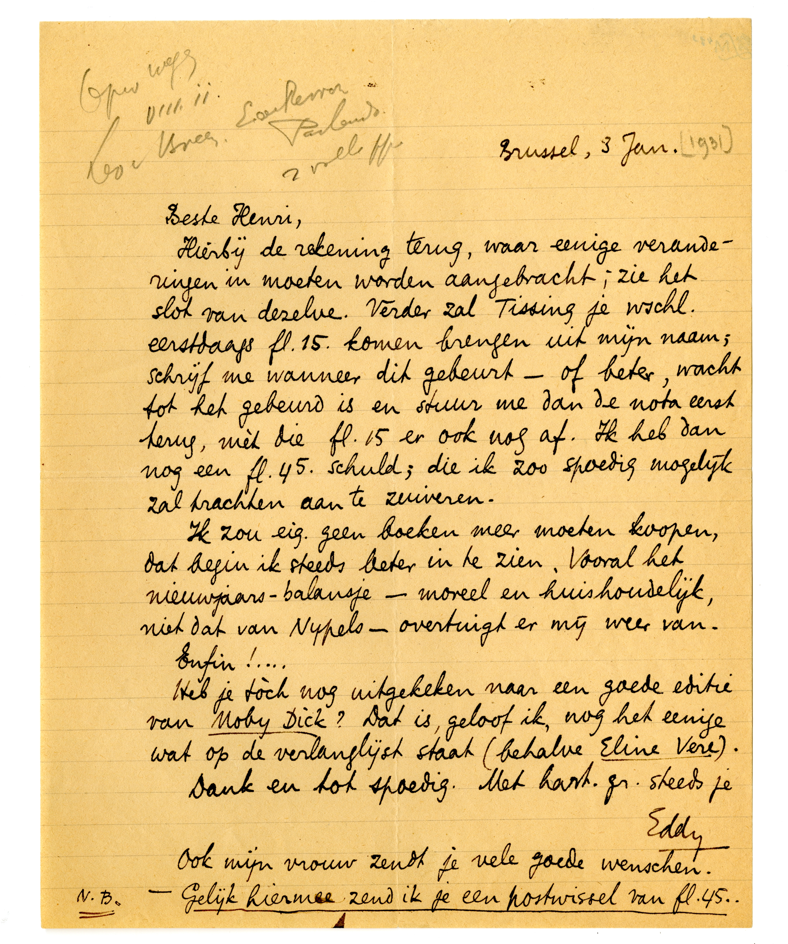 Hierbij de rekening terug, waar eenige veranderingen in moeten worden aangebracht; zie het slot van dezelve. Verder zal Tissing je wschl. eerstdaags fl.15. komen brengen uit mijn naam; schrijf me wanneer dit gebeurt - of beter, wacht tot het gebeurd is en stuur me dan de nota eerst terug, mèt die fl.15 er ook nog af. Ik heb dan nog een fl.45. schuld; die ik zoo spoedig mogelijk zal trachten aan te zuiveren.