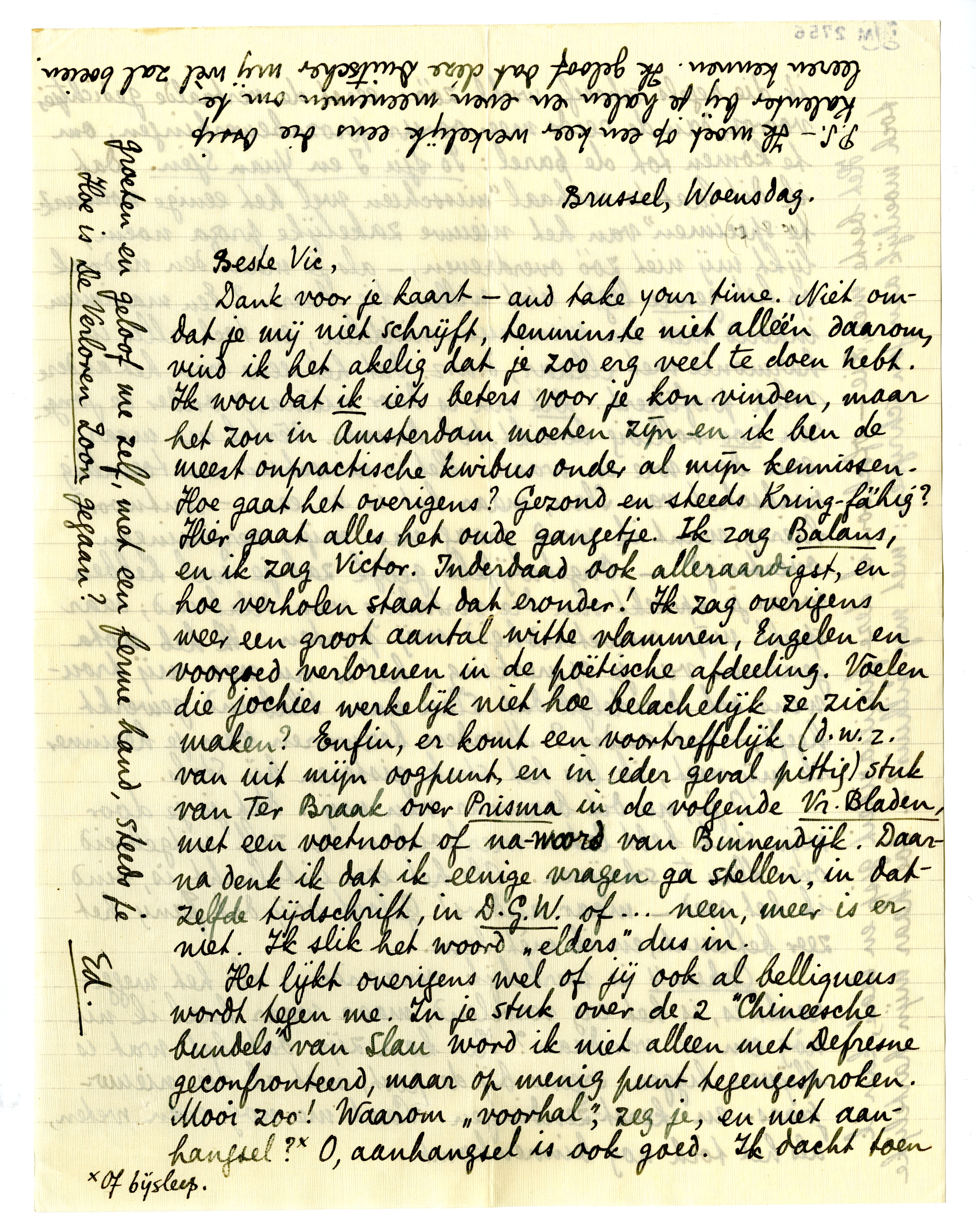 Dank voor je kaart - and take your time. Niet omdat je mij niet schrijft, tenminste niet alléén daarom, vind ik het akelig dat je zoo erg veel te doen hebt Ik wou dat ik iets beters voor je kon vinden, maar het zou in Amsterdam moeten zijn en ik ben de meest onpractische kwibus onder al mijn kennissen. Hoe gaat het overigens? Gezond en steeds Kring-fähig? Hier gaat alles het oude gangetje. Ik zag Balans, en ik zag Victor.1432 Inderdaad ook alleraardigst, en hoe verholen staat dat eronder! Ik zag overigens weer een groot aantal witte vlammen, Engelen en voorgoed verlorenen in de poëtische afdeeling.1433 Voelen die jochies werkelijk niet hoe belachelijk ze zich maken? Enfin, er komt een voortreffelijk (d.w.z. van uit mijn oogpunt, en in ieder geval pittig) stuk van Ter Braak over Prisma in de vol-gende Vr. Bladen1434, met een voetnoot of na-woord van Binnendijk. Daarna denk ik dat ik eenige vragen ga stellen, in datzelfde tijdschrift, in D.G.W. of... neen, meer is er niet. Ik slik het woord ‘elders’ dus in.