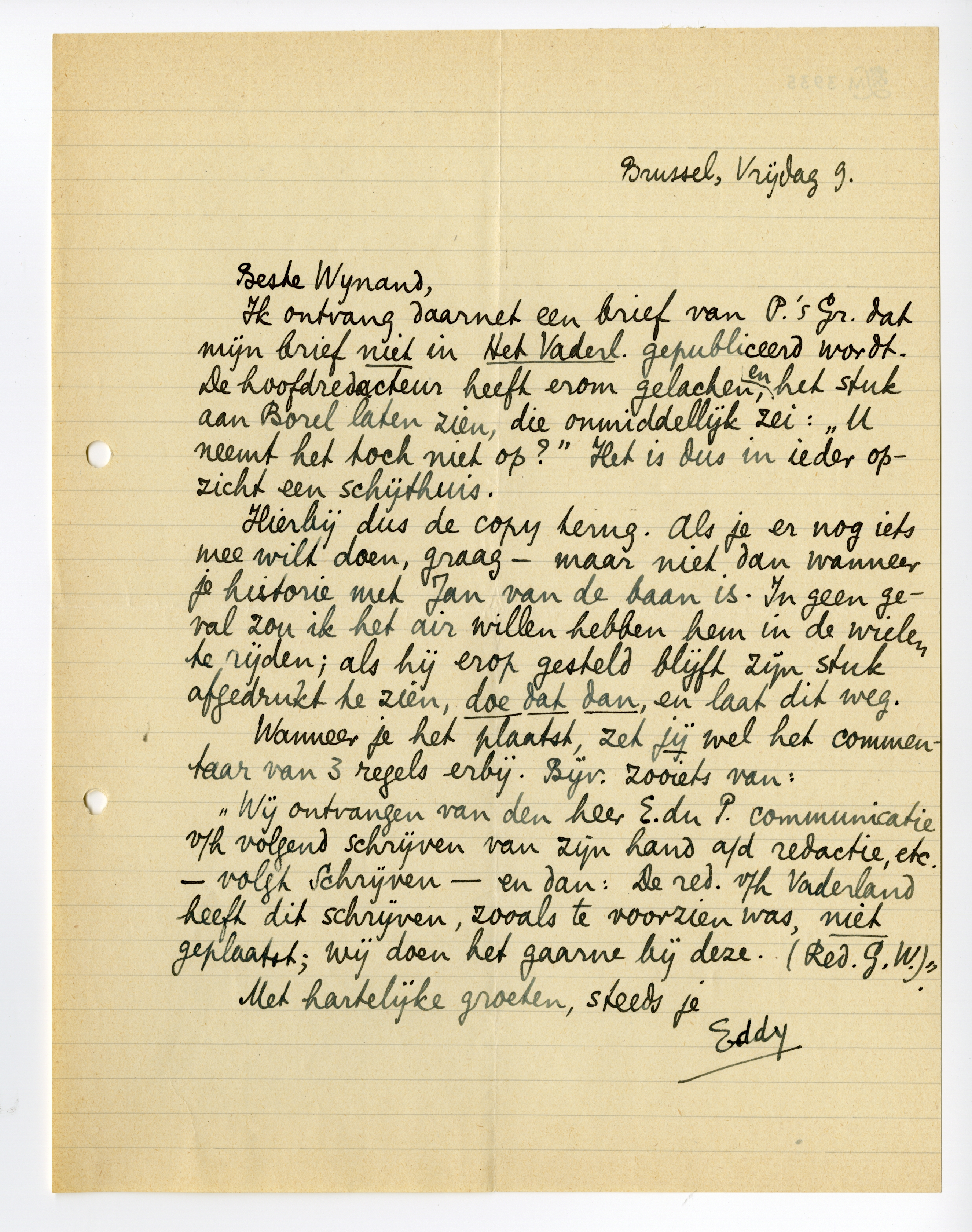 Ik ontvang daarnet een brief van P. 's Gr. dat mijn brief niet in Het Vaderl. gepubliceerd wordt. De hoofdredacteur heeft erom gelachen, en het stuk aan Borel laten zien, die onmiddellijk zei: ‘U neemt het toch niet op?’ Het is dus in ieder opzicht een schijthuis.