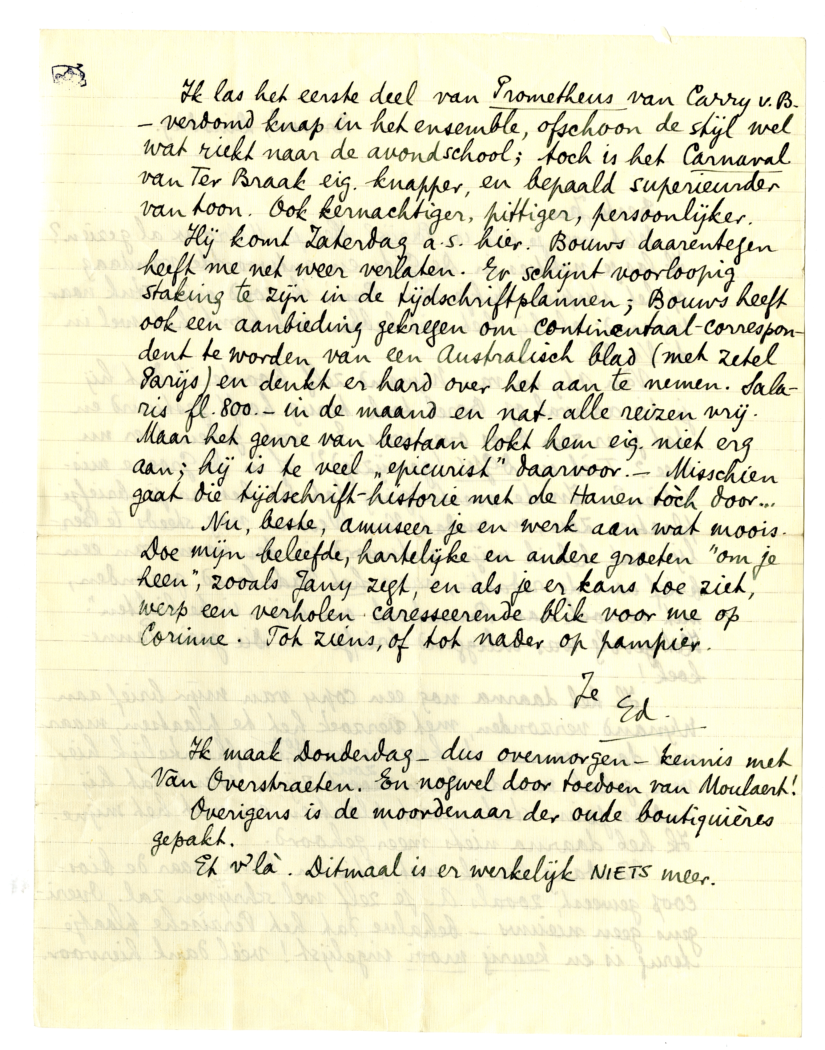 Nu, beste, amuseer je en werk aan wat moois. Doe mijn beleefde, hartelijke en andere groeten ‘om je heen’, zooals Jany zegt, en als je er kans toe ziet, werp een verholen caresseerende blik voor me op Corinne. Tot ziens, of tot nader op pampier.