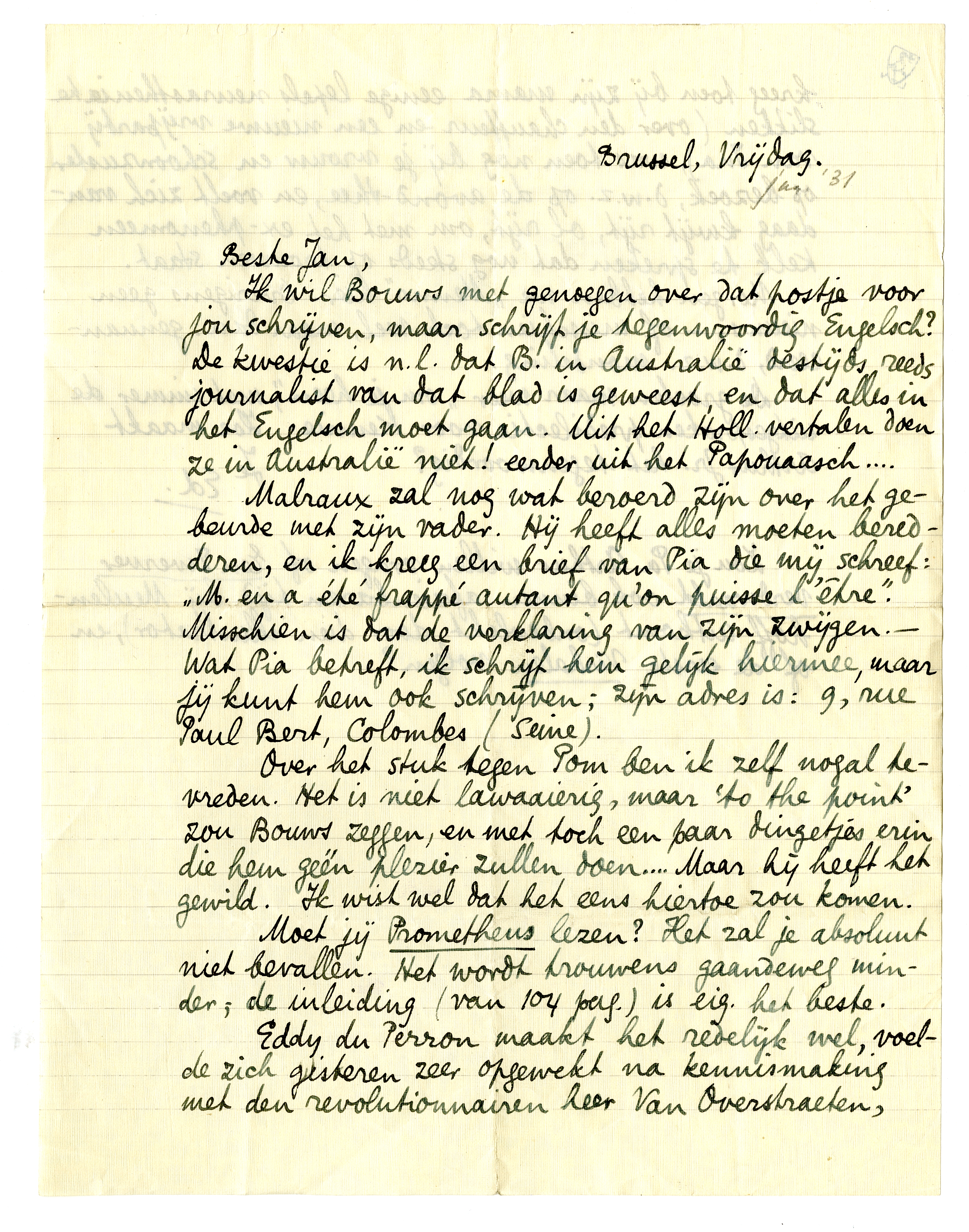 Malraux zal nog wat beroerd zijn over het gebeurde met zijn vader.1459 Hij heeft alles moeten beredderen, en ik kreeg een brief van Pia die mij schreef: ‘M. en a été frappé autant qu'on puisse l'être’. Misschien is dat de verklaring van zijn zwijgen. - Wat Pia betreft, ik schrijf hem gelijk hiermee, maar jij kunt hem ook schrijven; zijn adres is: 9, rue Paul Bert, Colombes (Seine).