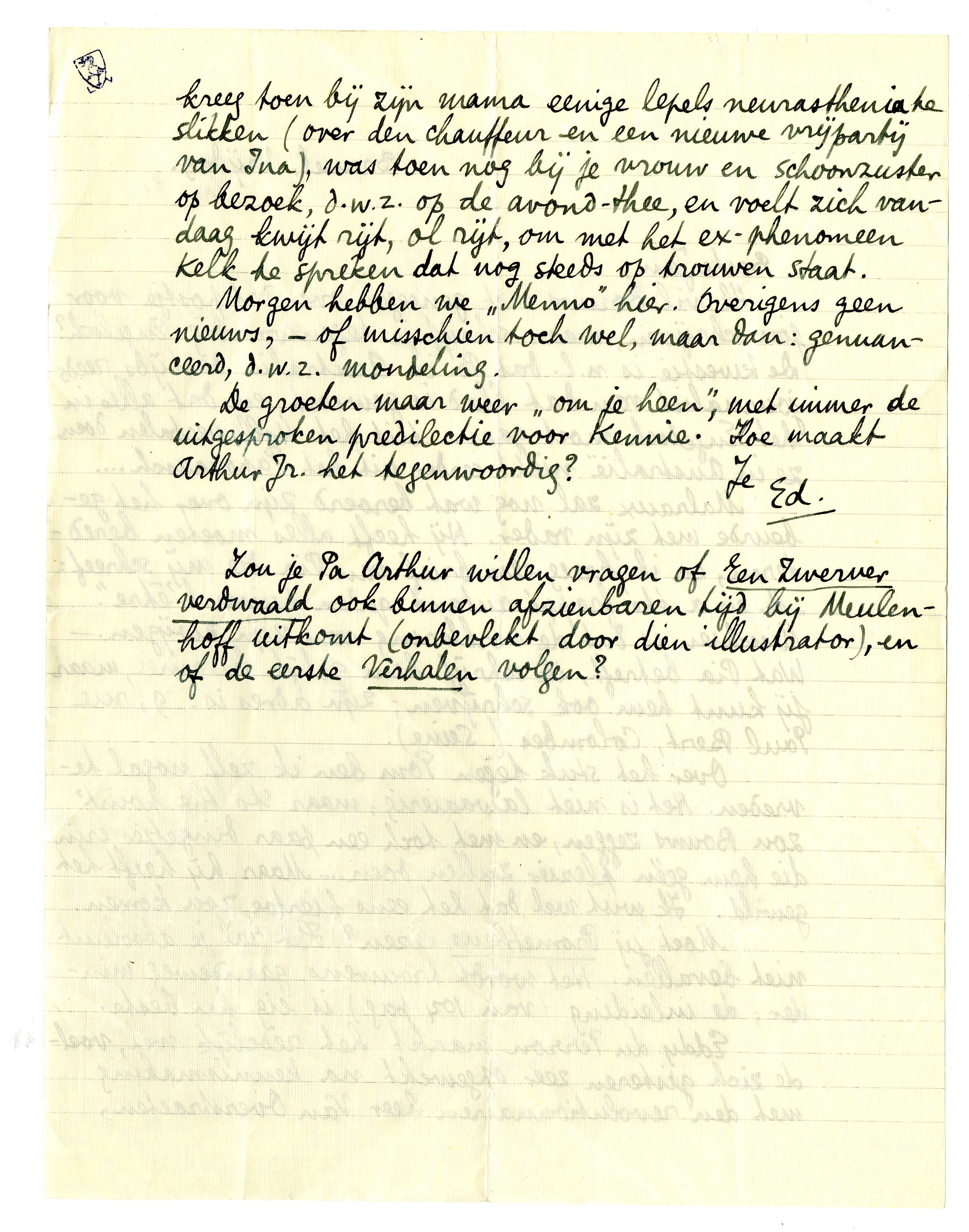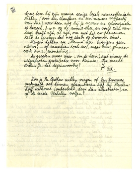 Eddy du Perron maakt het redelijk wel, voelde zich gisteren zeer opgewekt na kennismaking met den revolutionnairen heer Van Overstraeten, kreeg toen bij zijn mama eenige lepels neurasthenia te slikken (over den chauffeur en een nieuwe vrijpartij van Ina), was toen nog bij je vrouw en schoonzuster op bezoek, d.w.z. op de avond-thee, en voelt zich vandaag kwijt rijt, ol rijt, om met het exphenomeen Kelk te spreken dat nog steeds op trouwen staat.
