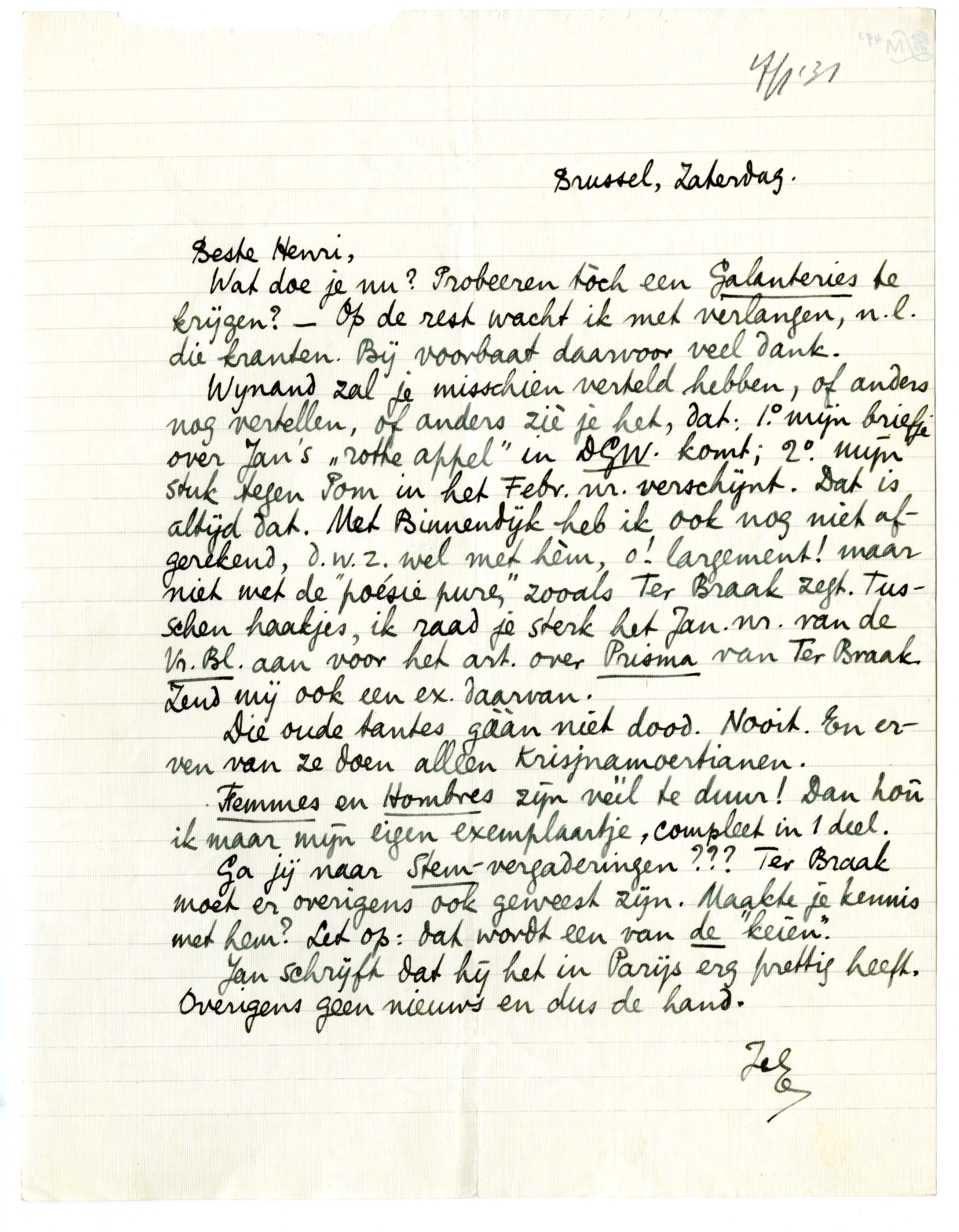 Wynand zal je misschien verteld hebben, of anders nog vertellen, of anders ziè je het, dat: 1o. mijn briefje over Jan's ‘rotte appel’ in DGW. komt; 2o. mijn stuk tegen Pom in het Febr. nr. verschijnt. Dat is altijd dat. Met Binnendijk heb ik ook nog niet afgerekend, d.w.z. wel met hèm, o! largement! maar niet met de ‘poésie pure’, zooals Ter Braak zegt. Tusschen haakjes, ik raad je sterk het Jan. nr. van de Vr. Bl. aan voor het art. over Prisma van Ter Braak. Zend mij ook een ex. daarvan.