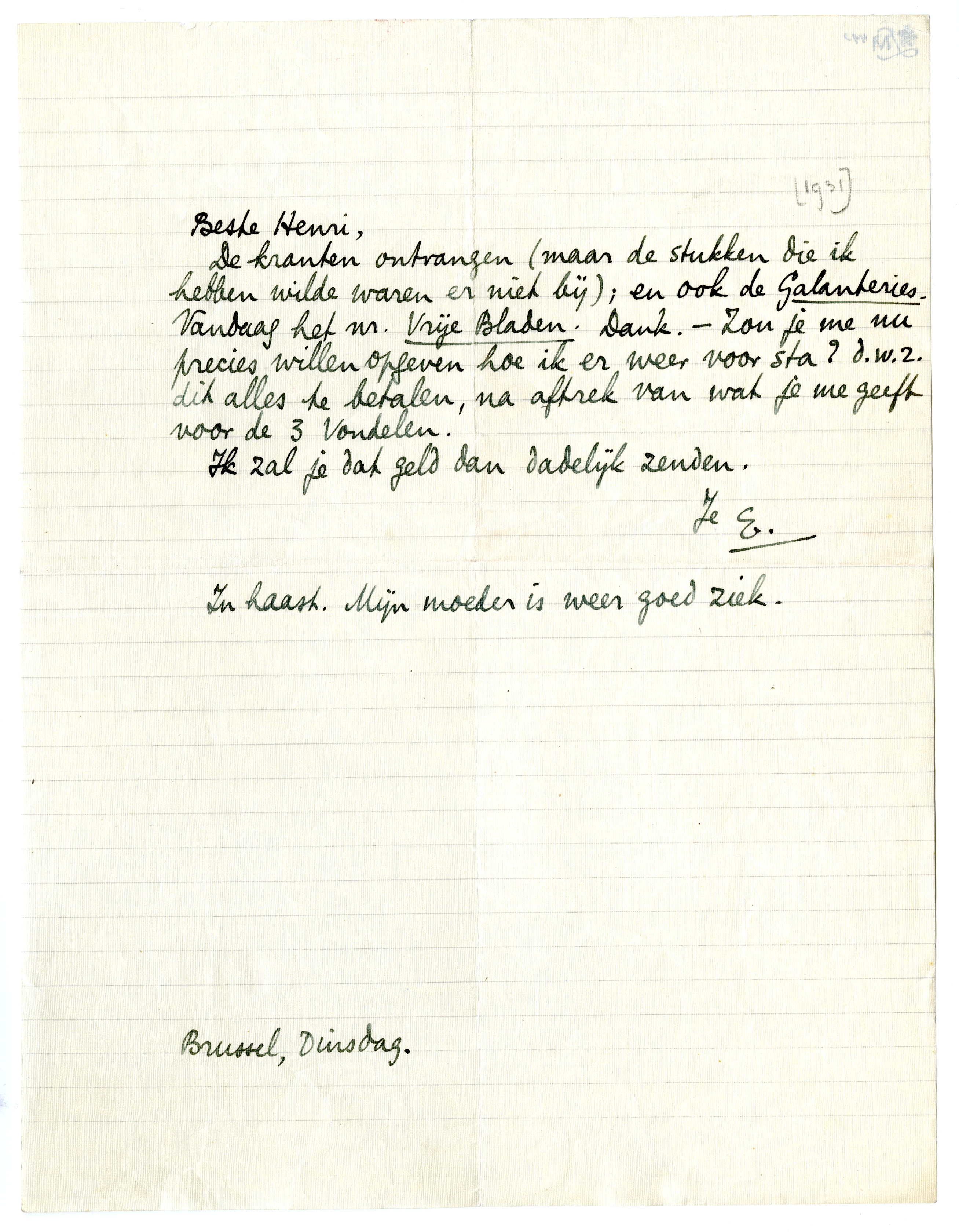 De kranten ontvangen (maar de stukken die ik hebben wilde waren er niet bij); en ook de Galanteries. Vandaag het nr. Vrije Bladen. Dank. - Zou je me nu precies willen opgeven hoe ik er weer voor sta? d.w.z. dit alles te betalen, na aftrek van wat je me geeft voor de 3 Vondelen.