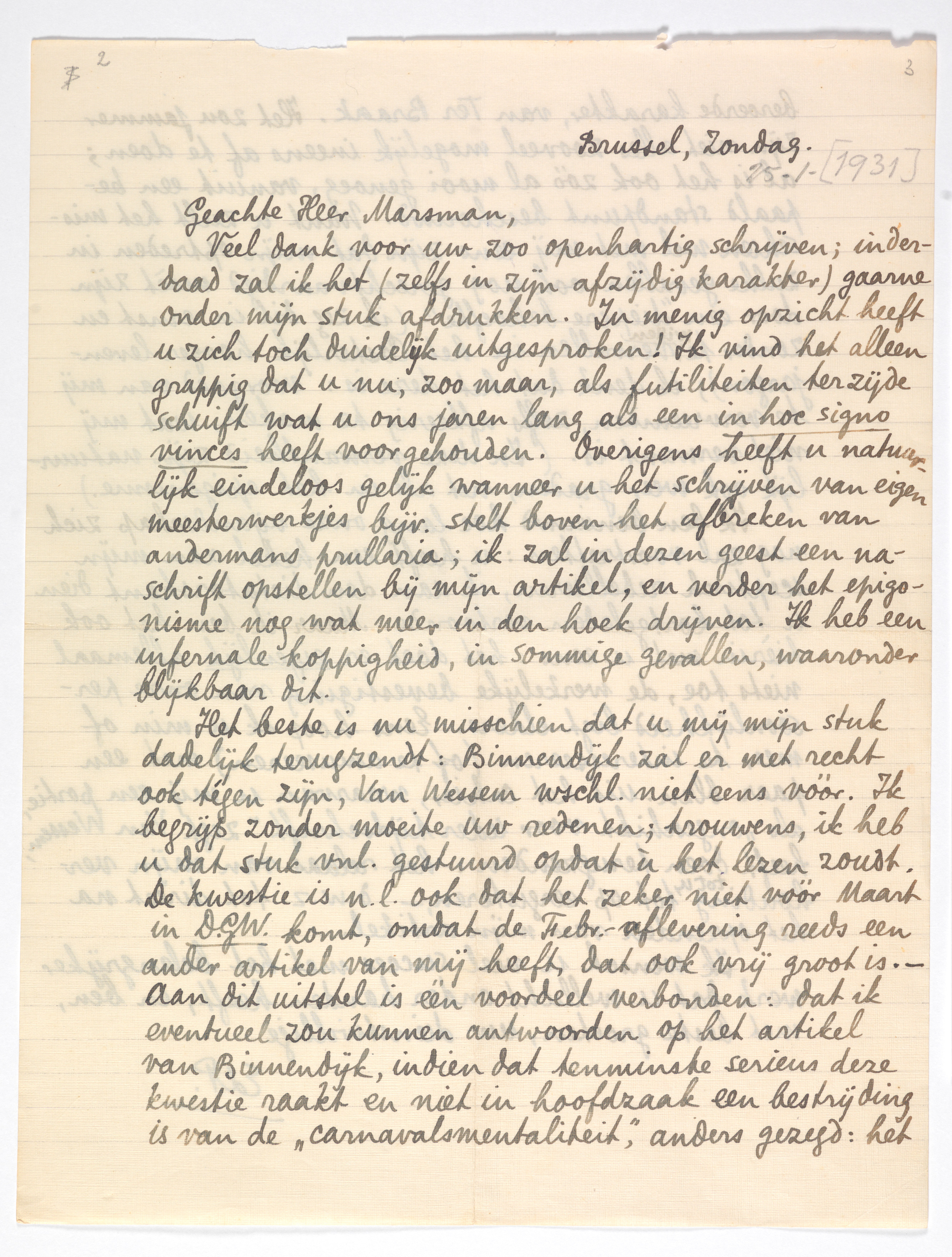 Veel dank voor uw zoo openhartig schrijven1481; inderdaad zal ik het (zelfs in zijn afzijdig karakter) gaarne onder mijn stuk afdrukken. In menig opzicht heeft u zich toch duidelijk uitgesproken! Ik vind het alleen grappig dat u nu, zoo maar, als futiliteiten terzijde schuift wat u ons jaren lang als een in hoc signo vinces heeft voorgehouden.1482 Overigens heeft u natuurlijk eindeloos gelijk wanneer u het schrijven van eigen meesterwerkjes bijv. stelt boven het afbreken van andermansprullaria; ik zal in dezen geest een naschrift opstellen bij mijn artikel, en verder het epigonisme nog wat meer in den hoek drijven. Ik heb een infernale koppigheid, in sommige gevallen, waaronder blijkbaar dit.