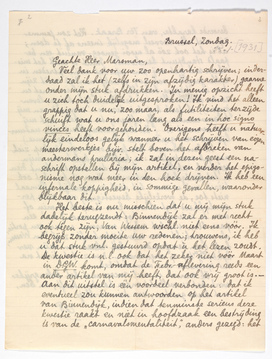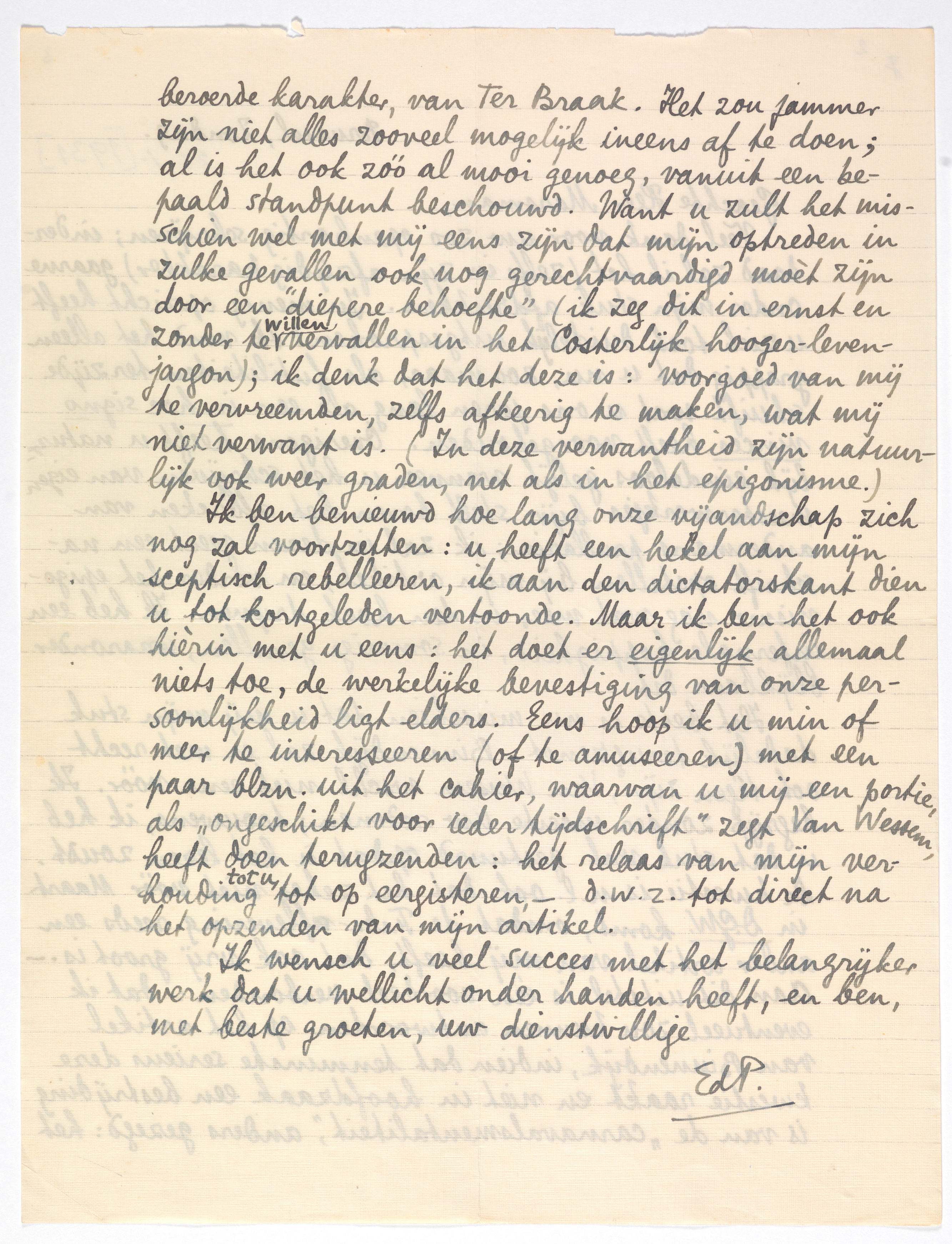 Het beste is nu misschien dat u mij mijn stuk dadelijk terugzendt: Binnendijk zal er met recht ook tégen zijn, Van Wessem wschl. niet eens vóór. Ik begrijp zonder moeite uw redenen; trouwens, ik heb u dat stuk vnl. gestuurd opdat ù het lezen zoudt. De kwestie is n.l. ook dat het zeker niet vóór Maart in D.G.W. komt, omdat de Febr.-aflevering reeds een ander artikel van mij heeft, dat ook vrij groot is.1483 - Aan dit uitstel is één voordeel verbonden: dat ik eventueel zou kunnen antwoorden op het artikel van Binnendijk,1484 indien dat tenminste serieus deze kwestie raakt en niet in hoofdzaak een bestrijding is van de ‘camavalsmentaliteit’, anders gezegd: het beroerde karakter, van Ter Braak. Het zou jammer zijn niet alles zooveel mogelijk ineens af te doen; al is het ook zóó al mooi genoeg, vanuit een bepaald standpunt beschouwd. Want u zult het misschien wel met mij eens zijn dat mijn optreden in zulke gevallen ook nog gerechtvaardigd moèt zijn door een ‘diepere behoefte’ (ik zeg dit in ernst en zonder te willen vervallen in het Costerlijk hooger-leven-jargon); ik denk dat het deze is: voorgoed van mij te vervreemden, zelfs afkeerig te maken, wat mij niet verwant is. (In deze verwantheid zijn natuurlijk ook weer graden, net als in het epigonisme.)
