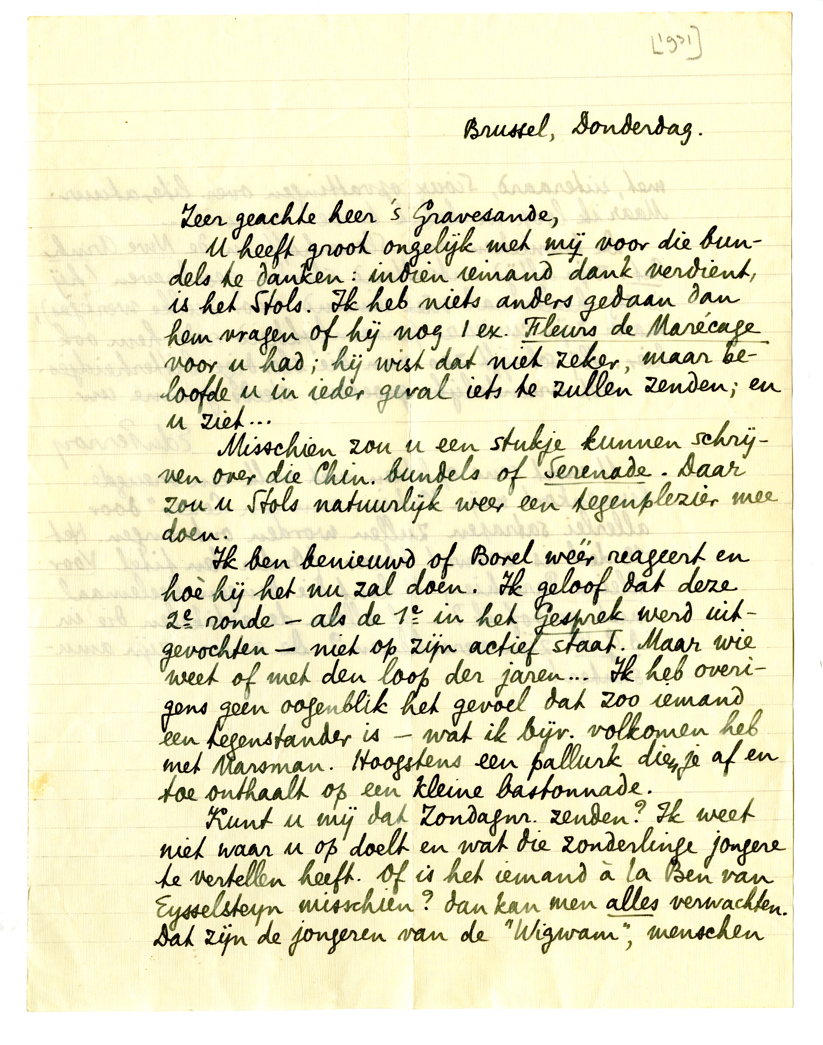 U heeft groot ongelijk met mij voor die bundels te danken: in-dien iemand dank verdient, is het Stols. Ik heb niets anders gedaan dan hem vragen of hij nog 1 ex. Fleurs de Marécage voor u had; hij wist dat niet zeker, maar beloofde u in ieder geval iets te zullen zenden; en u ziet...