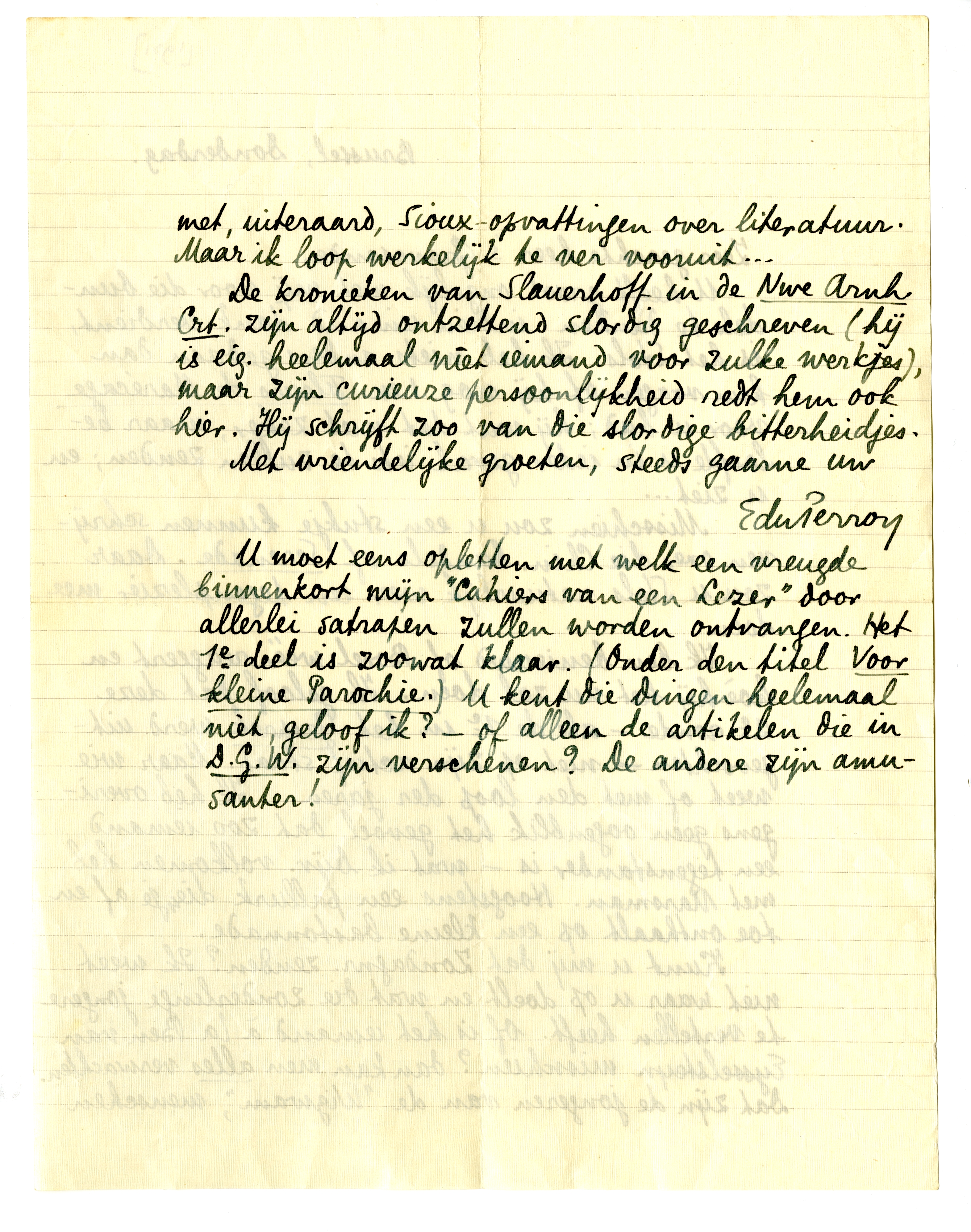 U moet eens opletten met welk een vreugde binnenkort mijn ‘Cahiers van een Lezer’ door allerlei satrapen zullen worden ontvangen. Het 1e deel is zoowat klaar. (Onder den titel Voor kleine Parochie.) U kent die dingen heelemaal niet, geloof ik? - of alleen de artikelen die in D.G.W. zijn verschenen? De andere zijn amusanter!