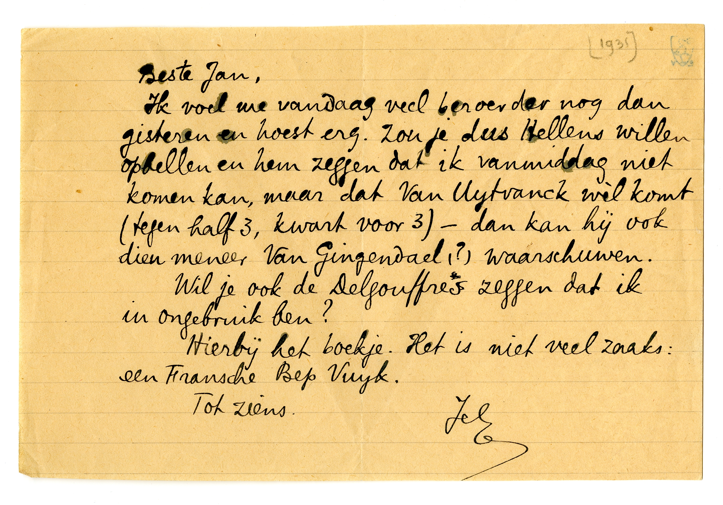 Ik voel me vandaag veel beroerder nog dan gisteren en hoest erg. Zou je dus Hellens willen opbellen en hem zeggen dat ik vanmiddag niet komen kan, maar dat Van Uytvanck wèl komt (tegen half 3, kwart voor 3) - dan kan hij ook dien meneer Van Gingendael (?)1491 waarschuwen.