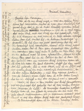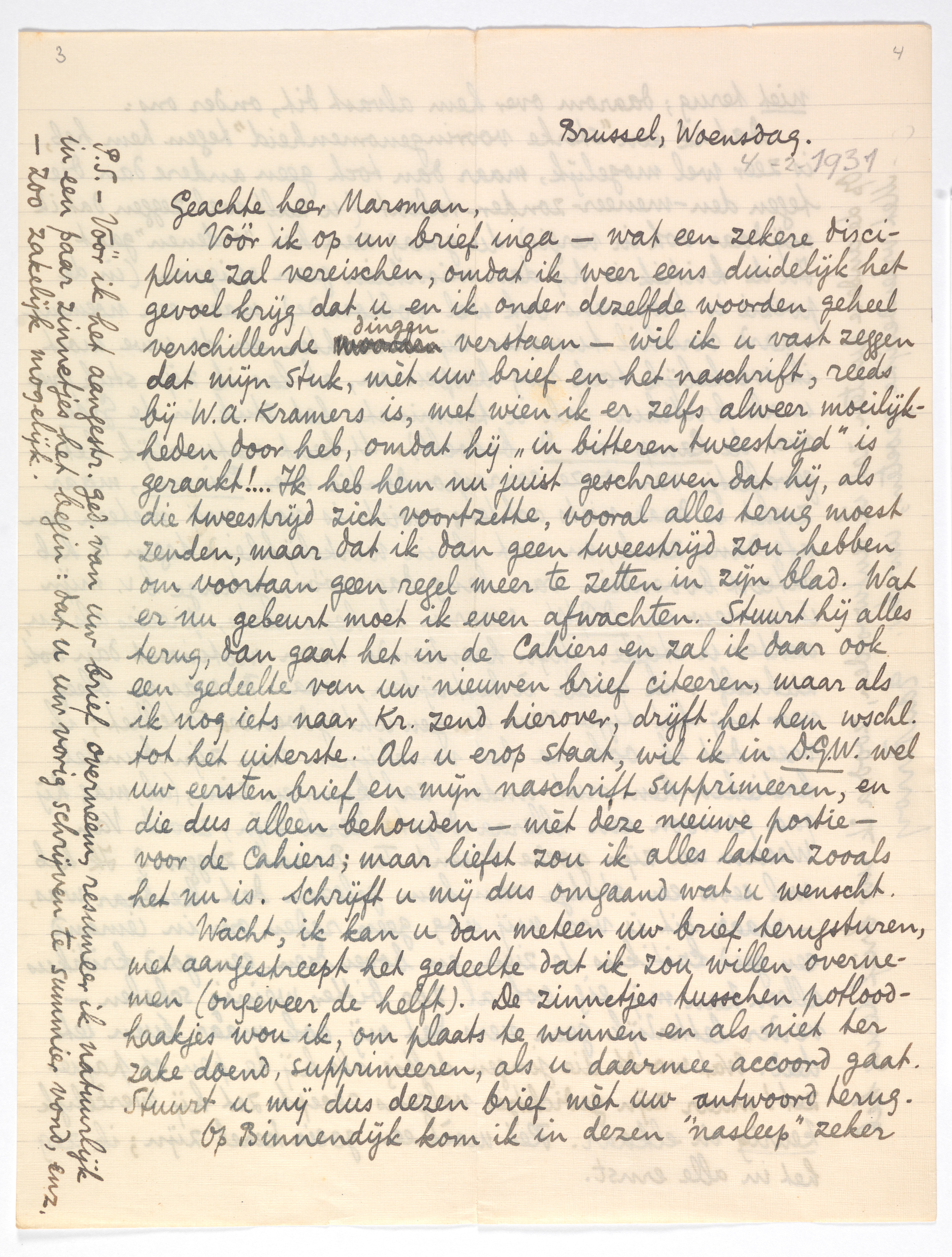 Vóór ik op uw brief1516 inga - wat een zekere discipline zal vereischen, omdat ik weer eens duidelijk het gevoel krijg dat u en ik onder dezelfde woorden geheel verschillende dingen verstaan - wil ik u vast zeggen dat mijn stuk, mèt uw brief en het naschrift, reeds bij W.A. Kramers is, met wien ik er zelfs alweer moeilijkheden door heb, omdat hij ‘in bitteren tweestrijd’ is geraakt!... Ik heb hem nu juist geschreven dat hij, als die tweestrijd zich voortzette, vooral alles terug moest zenden, maar dat ik dan geen tweestrijd zou hebben om voortaan geen regel meer te zetten in zijn blad. Wat er nu gebeurt moet ik even afwachten. Stuurt hij alles terug, dan gaat het in de Cahiers en zal ik daar ook een gedeelte van uw nieuwen brief citeeren, maar als ik nog iets naar Kr. zend hierover, drijft het hem wschl. tot het uiterste. Als u erop staat, wil ik in D.G.W. wel uw eersten brief en mijn naschrift supprimeeren, en die dus alleen behouden - mèt deze nieuwe portie - voor de Cahiers; maar liefst zou ik alles laten zooals het nu is. Schrijft u mij dus omgaand wat u wenscht.
