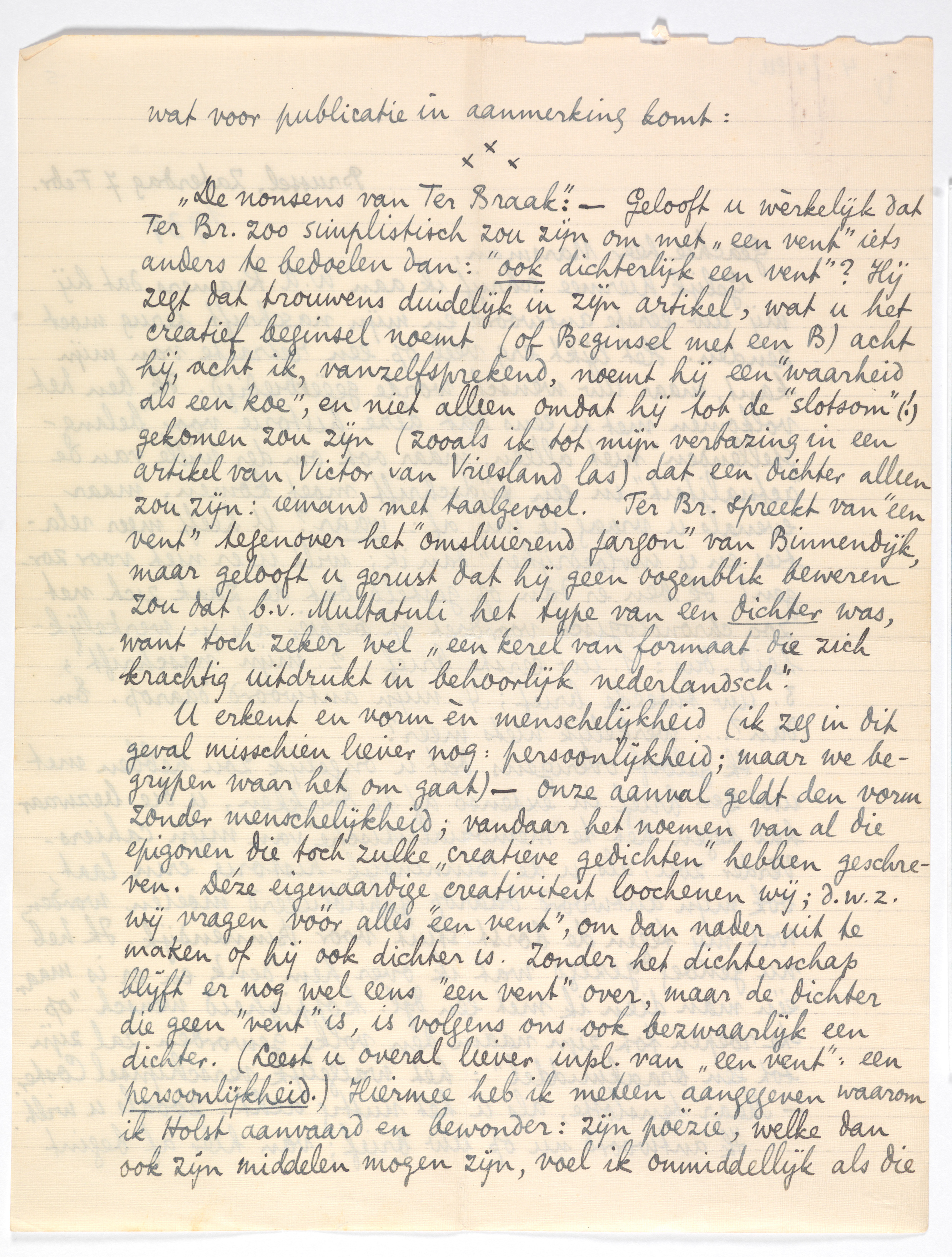 ‘De nonsens van Ter Braak’: - Gelooft u wèrkelijk dat Ter Br. zoo simplistisch zou zijn om met ‘een vent’ iets anders te bedoelen dan: ‘ook dichterlijk een vent’? Hij zegt dat trouwens duidelijk in zijn artikel, wat u het creatief beginsel noemt (of Beginsel met een B) acht hij, acht ik, vanzelfsprekend, noemt hij een ‘waarheid als een koe’, en niet alleen omdat hij tot de ‘slotsom’ (!) gekomen zou zijn (zooals ik tot mijn verbazing in een artikel van Victor van Vriesland1533 las) dat een dichter alleen zou zijn: iemand met taalgevoel. Ter Br. spreekt van ‘een vent’ tegenover het ‘omsluierend jargon’ van Binnendijk, maar gelooft u gerust dat hij geen oogenblik beweren zou dat b.v. Multatuli het type van een dichter was, want toch zeker wel ‘een kerel van formaat die zich krachtig uitdrukt in behoorlijk nederlandsch’.