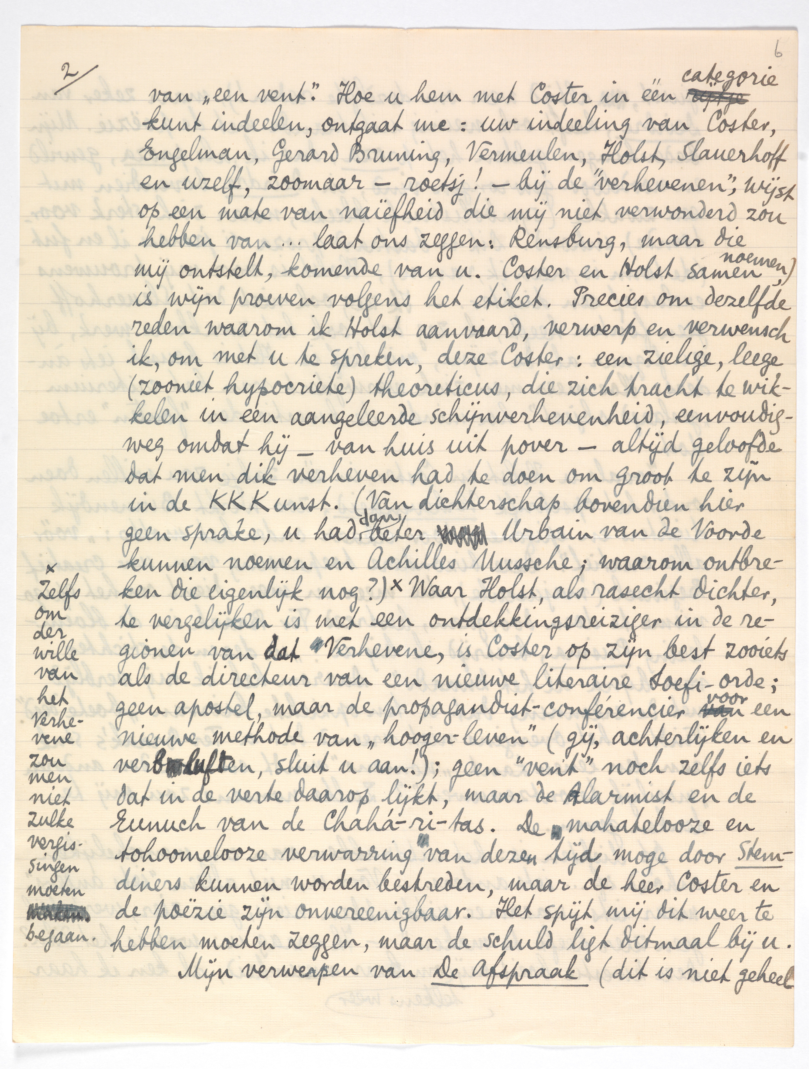 U erkent èn vorm èn menschelijkheid (ik zeg in dit geval misschien liever nog: persoonlijkheid; maar we begrijpen waar het om gaat) - onze aanval geldt den vorm zonder menschelijkheid; vandaar het noemen van al die epigonen, die toch zulke ‘creatieve gedichten’ hebben geschreven. Déze eigenaardige creativiteit loochenen wij; d.w.z. wij vragen vóór alles ‘een vent’, om dan nader uit te maken of hij ook dichter is. Zonder het dichterschap blijft er nog wel eens ‘een vent’ over, maar de dichter die geen ‘vent’ is, is volgens ons ook bezwaarlijk een dichter. (Leest u overal inpl. van ‘een vent’: een persoonlijkheid.) Hier mee heb ik meteen aangegeven waarom ik Holst aanvaard en bewonder: zijn poëzie, welke dan ook zijn middelen mogen zijn, voel ik onmiddellijk als die van ‘een vent’. Hoe u hem met Coster in één categorie kunt indeelen, ontgaat me: uw indeeling van Coster, Engelman, Gerard Bruning, Vermeulen, Holst, Slauerhoff en uzelf, zoomaar - roetsj! - bij de ‘verhevenen’, wijst op een mate van naïefheid die mij niet verwonderd zou hebben van... laat ons zeggen: Rensburg,1534 maar die mij ontstelt, komende van u. Coster en Holst samen noemen, is wijn proeven volgens het etiket. Precies om dezelfde reden waarom ik Holst aanvaard, verwerp en verwensch ik, om met u te spreken, deze Coster: een zielige, leege (zooniet hypocriete) theoreticus, die zich tracht te wikkelen in een aangeleerde schijnverhevenheid, eenvoudigweg omdat hij - van huis uit pover - altijd geloofde dat men dik verheven had te doen om groot te zijn in de KKKunst. (Van dichterschap bovendien hier geen sprake, u had dan beter Urbain van de Voorde kunnen noemen en Achilles Mussche; waarom ontbreken die eigenlijk nog?)* Waar Holst, als rasecht dichter, te vergelijken is met een ontdekkingsreiziger in de regionen van dat Verhevene, is Coster op zijn best zooiets als de directeur van een nieuwe literaire Soefi-orde; geen apostel, maar de propagandist-conférencier voor een nieuwe methode van ‘hooger-leven’ (gij, achterlijken en verbluften, sluit u aan!); geen ‘vent’ noch zelfs iets dat in de verte daarop lijkt, maar de Alarmist en de Eunuch van de Chahá-ri-tas. De mahatelooze en tohoomelooze verwarring van dezen tijd moge door Stem-diners kunnen worden bestreden,1535 maar de heer Coster en de poëzie zijn onvereenigbaar. Het spijt mij dit weer te hebben moeten zeggen, maar de schuld ligt ditmaal bij u.