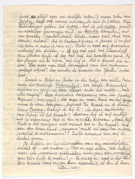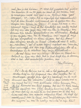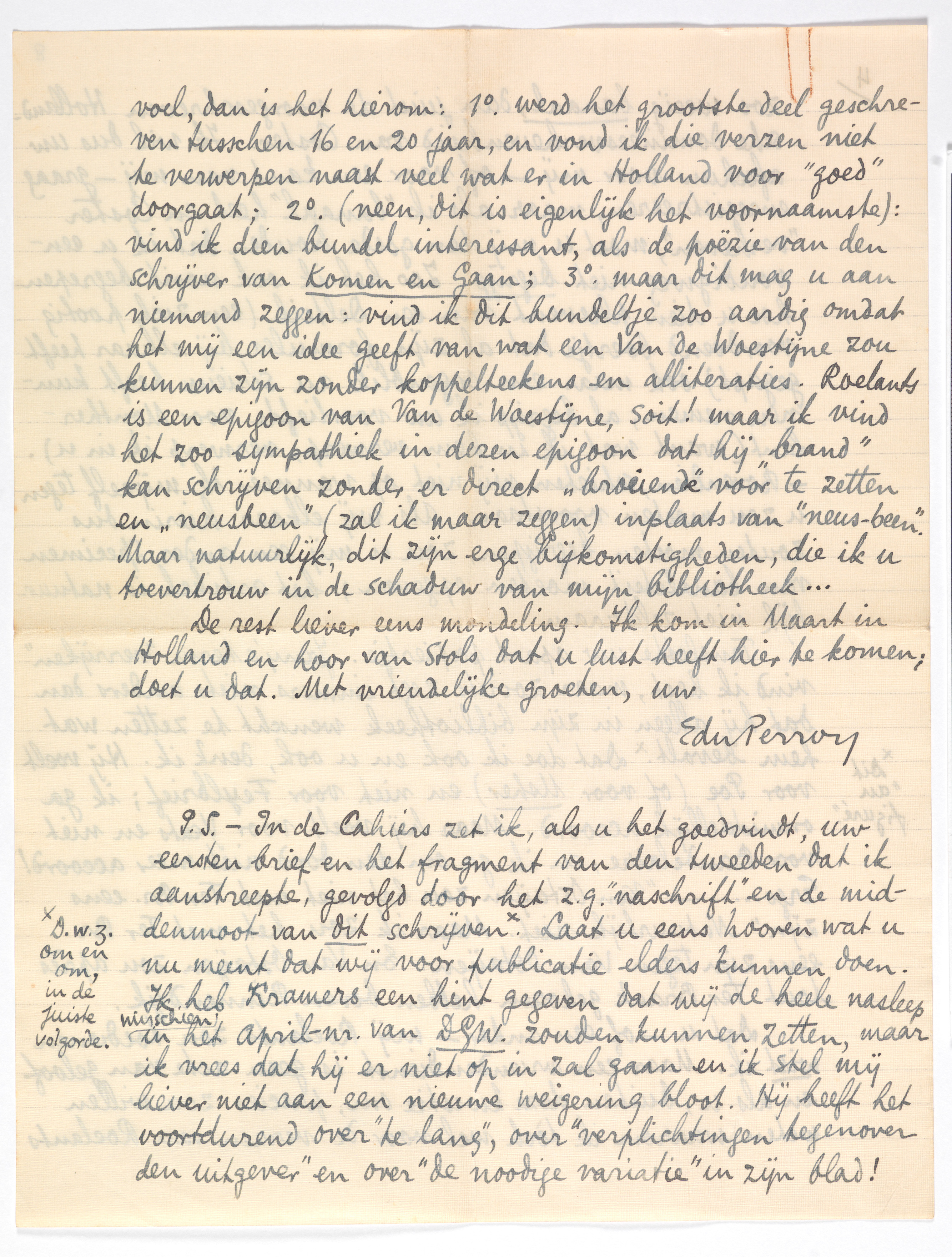 P.S. - In de Cahiers zet ik, als u het goedvindt, uw eersten brief en het fragment van den tweeden dat ik aanstreepte, gevolgd door het z.g. ‘naschrift’ en de middenmoot van dit schrijven.* Laat u eens hooren wat u nu meent dat wij voor publicatie elders kunnen doen. Ik heb Kramers een hint gegeven dat wij de heele nasleep misschien in het April-nr. van DGW. zouden kunnen zetten, maar ik vrees dat hij er niet op in zal gaan en ik stel mij liever niet aan een nieuwe weigering bloot. Hij heeft het voortdurend over ‘te lang’, over ‘verplichtingen tegenover den uitgever’ en over ‘de noodige variatie’ in zijn blad!