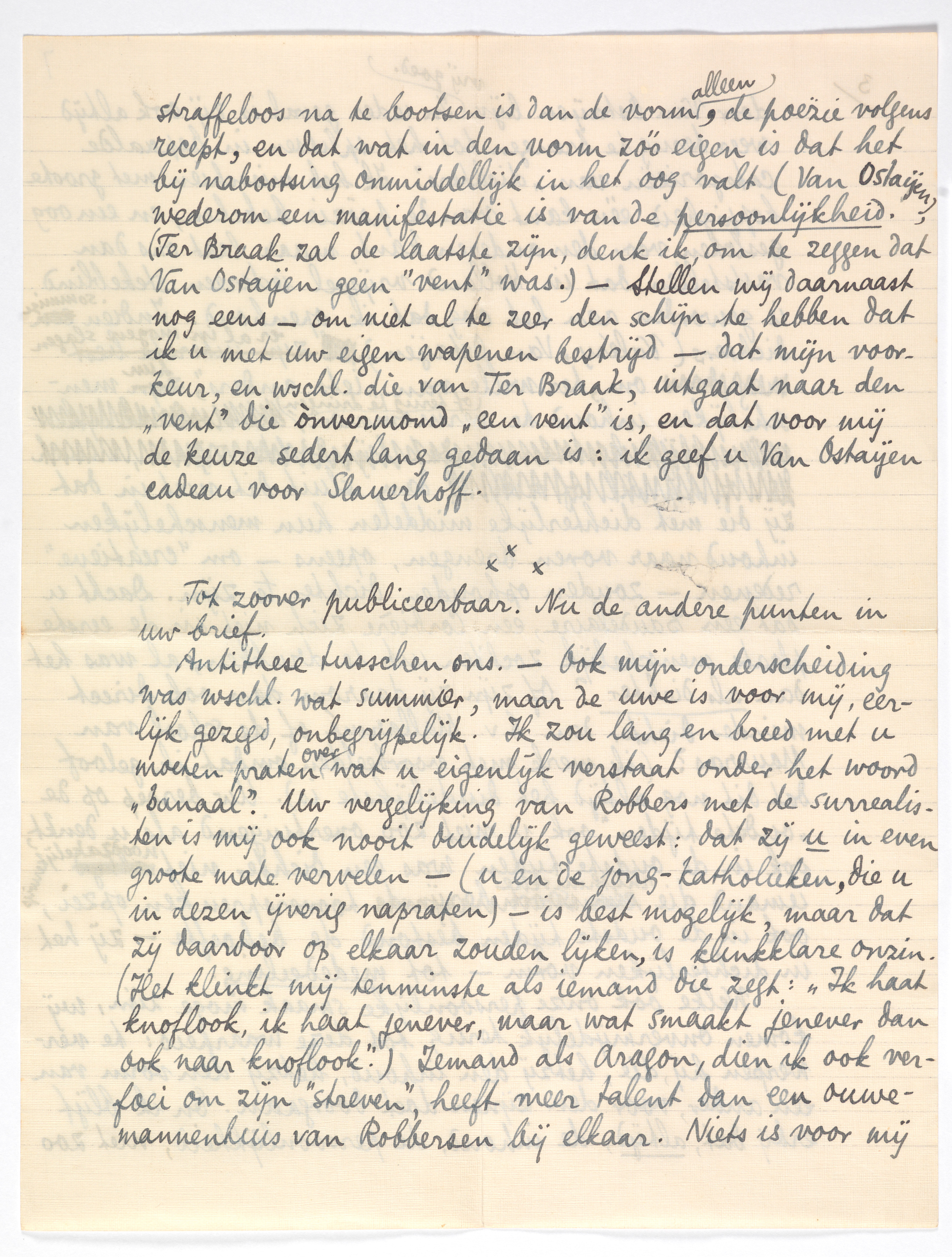 Welke ook onze persoonlijke smaak moge zijn, wij komen onvermijdelijk terug tot deze waarheid: te verwerpen hij, die, hetzij den inhoud, hetzij den vorm van een ander, voor den zijnen doet doorgaan. En ik blijf erbij dat, altijd, de inhoud, de persoonlijkheid, niet zoo straffeloos na te bootsen is dan de vorm alleen, de poëzie volgens recept, en dat wat in den vorm zóó eigen is dat het bij nabootsing onmiddellijk in het oog valt (Van Ostaijen) wederom een manifestatie is van de persoonlijkheid. (Ter Braak zal de laatste zijn, denk ik, om te zeggen dat Van Ostaijen geen ‘vent’ was.) - Stellen wij daarnaast nog eens - om niet al te zeer den schijn te hebben dat ik u met uw eigen wapenen bestrijd - dat mijn voorkeur, en wschl. die van Ter Braak, uitgaat naar den ‘vent’ die ònvermomd ‘een vent’ is, en dat voor mij de keuze sedert lang gedaan is: ik geef u Van Ostaijen cadeau voor Slauerhoff.