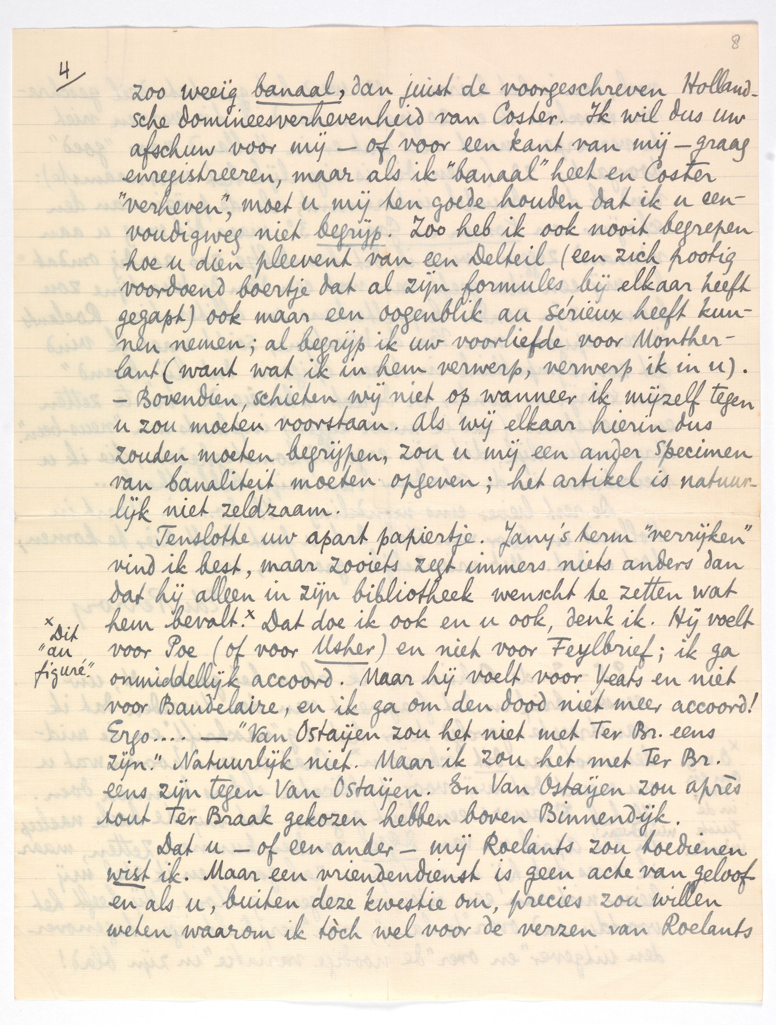Tenslotte uw apart papiertje. Jany's term ‘verrijken’ vind ik best, maar zooiets zegt immers niets anders dan dat hij alleen in zijn bibliotheek wenscht te zetten wat hem bevalt.* Dat doe ik ook en u ook, denk ik. Hij voelt voor Poe (of voor Usher) en niet voor Feylbrief; ik ga onmiddellijk accoord. Maar hij voelt voor Yeats en niet voor Baudelaire, en ik ga om den dood niet meer accoord! Ergo.... - ‘Van Ostaijen zou het niet met Ter Br. eens zijn.’ Natuurlijk niet. Maar ik zou het met Ter Br. eens zijn tegen Van Ostaijen. En Van Ostaijen zou après tout Ter Braak gekozen hebben boven Binnendijk.