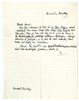 Van Jan vernam ik dat ik in Opw. Wegen word ‘gehoond’ om mijn stuk over Slau.1546 (Hij hoorde dat van jou.) Kan je mij, als het stuk niet te lang is, de desbetreffende passage althans bezorgen: overgeschreven of getypt; - is dit te veel moeite, dan maar het heele nr. hierheen.