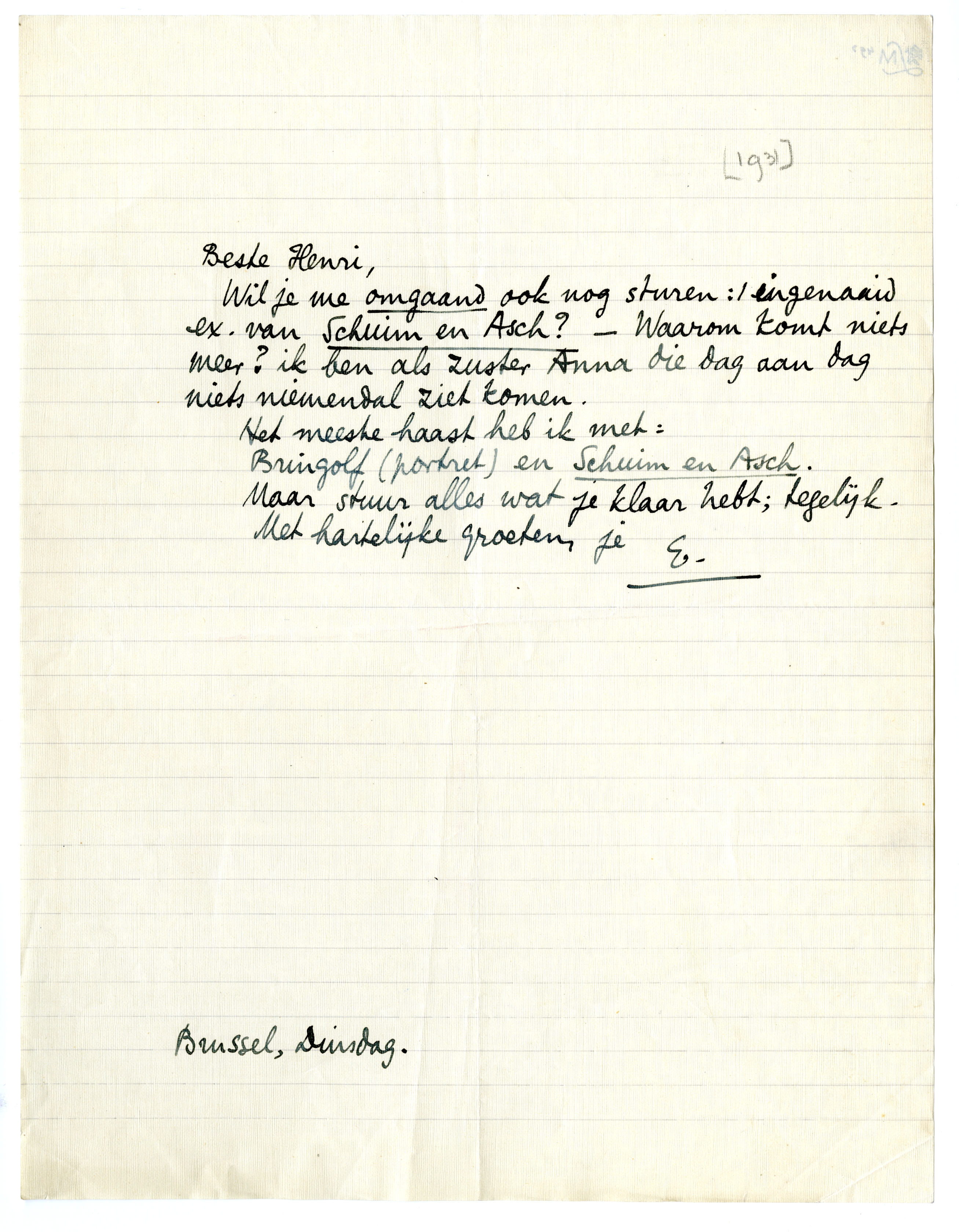 Wil je me omgaand ook nog sturen: 1 ingenaaid ex. van Schuim en Asch? - Waarom komt niets meer? ik ben als zuster Anna die dag aan dag niets niemendal ziet komen.