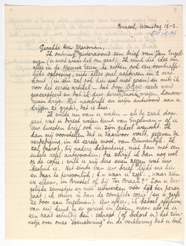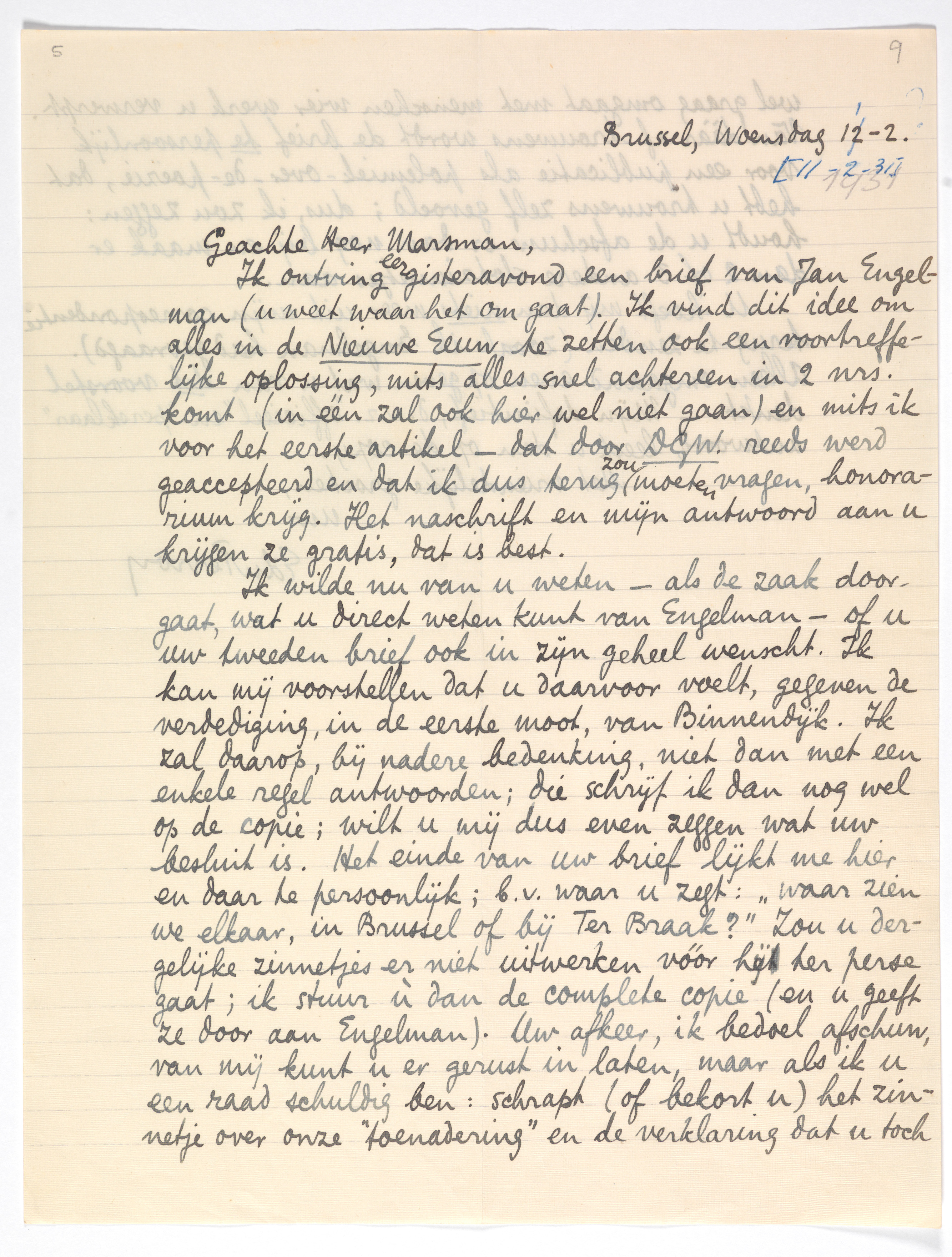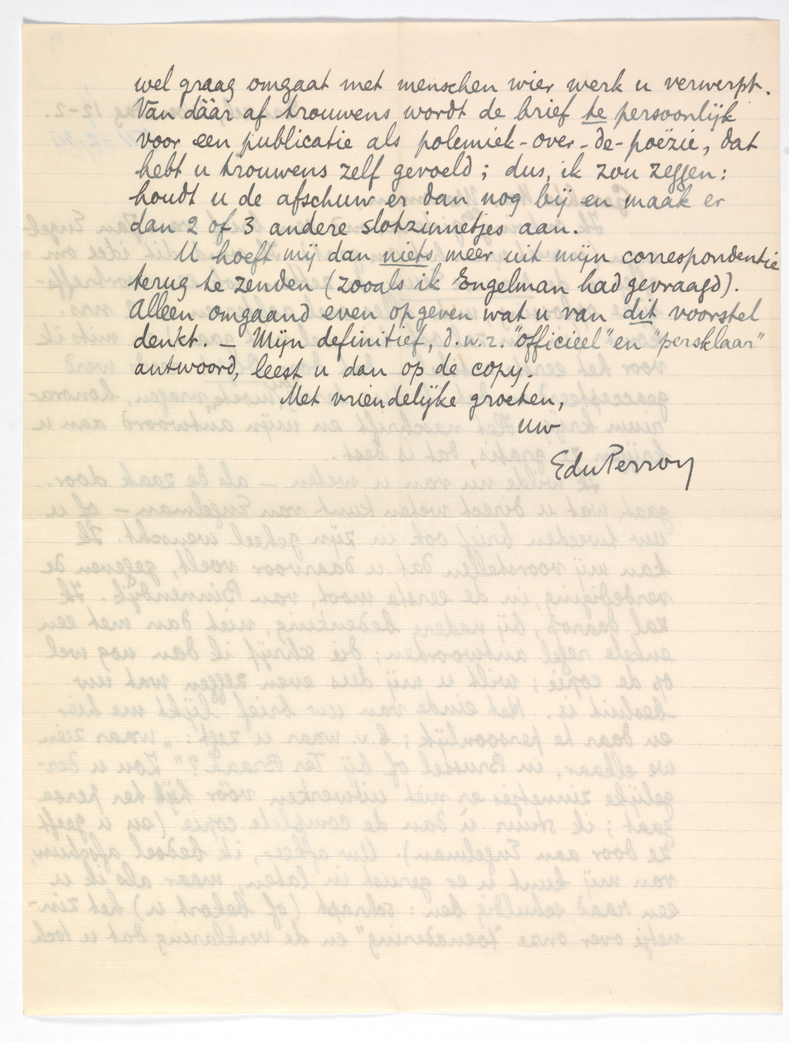 Ik wilde nu van u weten - als de zaak doorgaat, wat u direct weten kunt van Engelman - of u uw tweeden brief ook in zijn geheel wenscht. Ik kan mij voorstellen dat u daarvoor voelt, gegeven de verdediging, in de eerste moot, van Binnendijk. Ik zal daarop, bij nadere bedenking, niet dan met een enkele regel antwoorden; die schrijf ik dan nog wel op de copie; wilt u mij dus even zeggen wat uw besluit is. Het einde van uw brief lijkt me hier en daar te persoonlijk; b.v. waar u zegt: ‘waar zien we elkaar, in Brussel of bij Ter Braak?’ Zou u dergelijke zinnetjes er niet uitwerken vóór hij ter perse gaat; ik stuur ù dan de complete copie (en u geeft ze door aan Engelman). Uw afkeer, ik bedoel afschuw, van mij1548 kunt u er gerust in laten, maar als ik u een raad schuldig ben: schrapt (of bekort u) het zinnetje over onze ‘toenadering’ en de verklaring dat u toch wel graag omgaat met menschen wier werk u verwerpt. Van dààr af trouwens wordt de brief te persoonlijk voor een publicatie als polemiek-over-de-poëzie, dat hebt u trouwens zelf gevoeld; dus, ik zou zeggen: houdt u de afschuw er dan nog bij en maak er dan 2 of 3 andere slotzinnetjes aan.