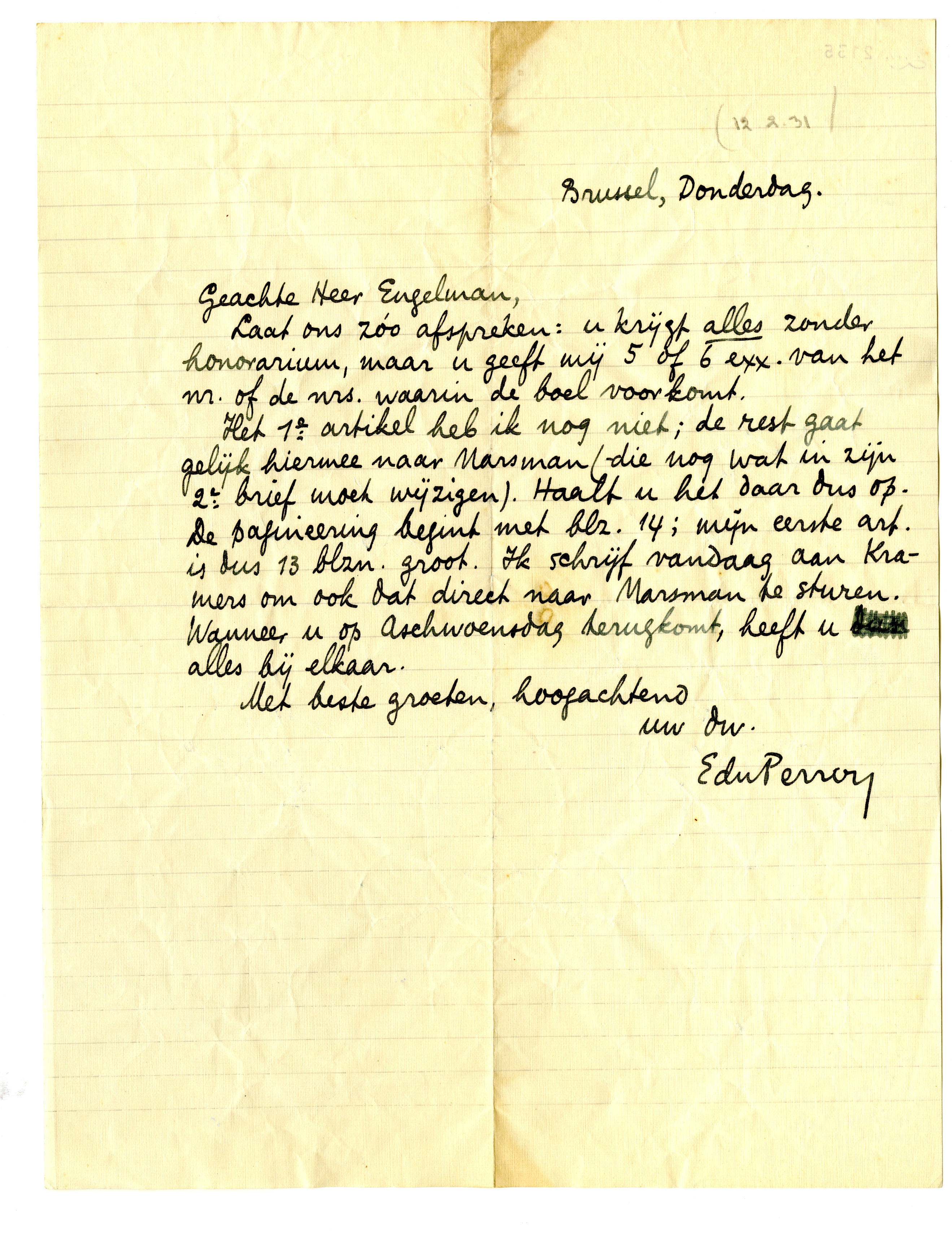 Het 1e artikel heb ik nog niet; de rest gaat gelijk hiermee naar Marsman (- die nog wat in zijn 2e brief moet wijzigen). Haalt u het daar dus op. De pagineering begint met blz. 14; mijn eerste art. is dus 13 blzn. groot. Ik schrijf vandaag aan Kramers om ook dat direct naar Marsman te sturen. Wanneer u op Aschwoensdag terugkomt, heeft u alles bij elkaar.