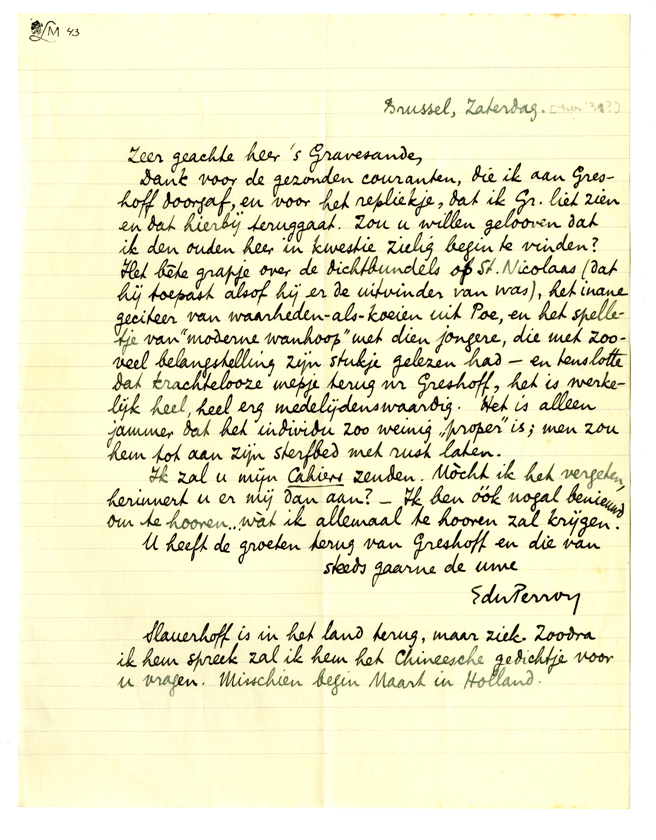 Dank voor de gezonden couranten,1550 die ik aan Greshoff doorgaf, en voor het repliek je, dat ik Gr. liet zien en dat hierbij teruggaat. Zou u willen gelooven dat ik den ouden heer in kwestie zielig begin te vinden? Het bête grapje over de dichtbundels op St. Nicolaas (dat hij toepast alsof hij er de uitvinder van was), het inane geciteer van waarheden-als-koeien uit Poe, en het spelletje van ‘moderne wanhoop’ met dien jongere, die met zoo veel belangstelling zijn stukje gelezen had - en tenslotte dat krachtelooze mepje terug nr Greshoff, het is werkelijk heel, heel erg medelijdenswaardig. Het is alleen jammer dat het individu zoo weinig ‘proper’ is; men zou hem tot aan zijn sterfbed met rust laten.