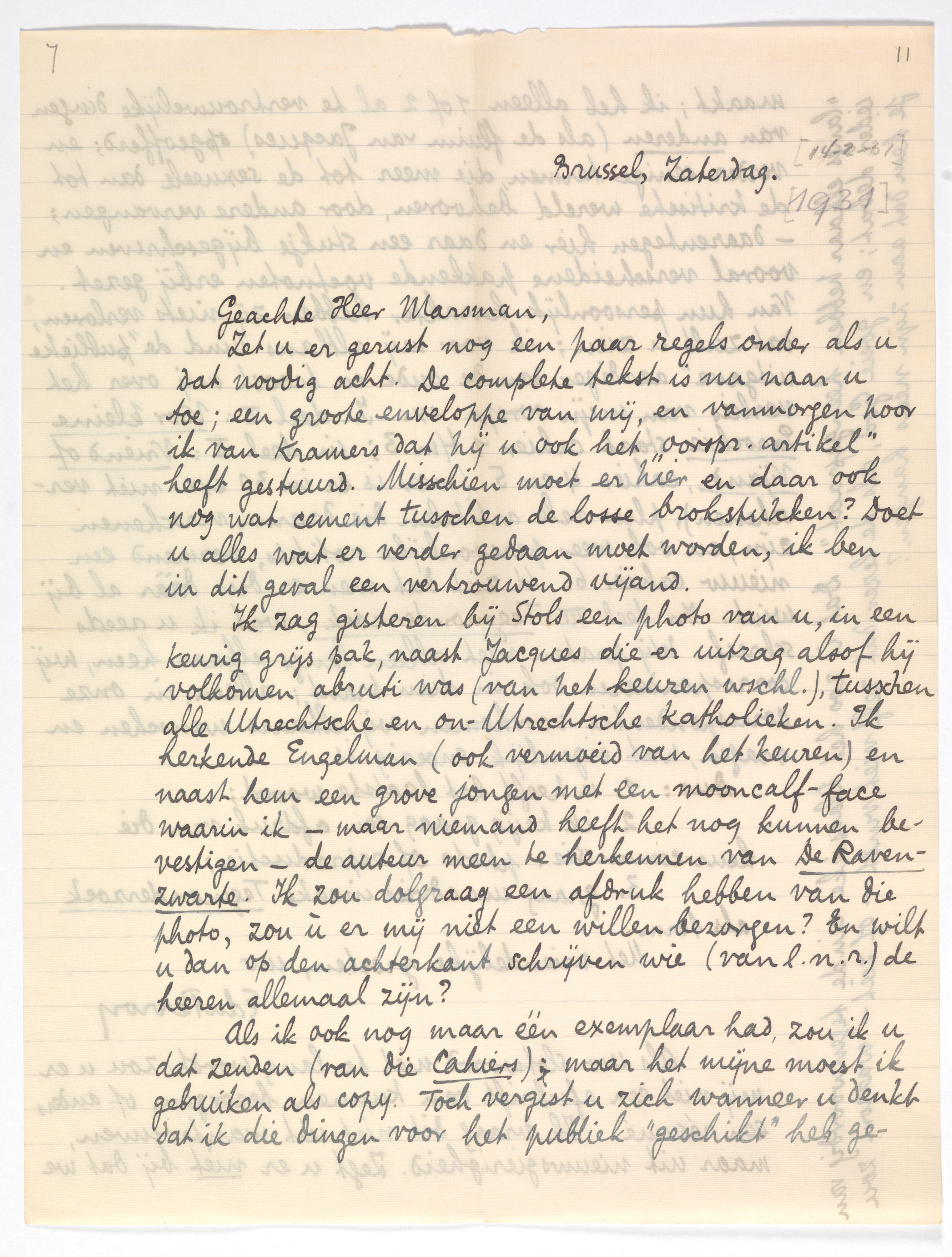 Ik zag gisteren bij Stols een photo van u,1551 in een keurig grijs pak, naast Jacques die er uitzag alsof hij volkomen abruti was (van het keuren wschl.), tusschen alle Utrechtsche en on-Utrechtsche katholieken. Ik herkende Engelman (ook vermoeid van het keuren) en naast hem een grove jongen met een mooncalf-face waarin ik - maar niemand heeft het nog kunnen bevestigen - de auteur meen te herkennen van De Ravenzwarte.1552 Ik zou dolgraag een af-druk hebben van die photo, zou ù er mij niet een willen bezorgen? En wilt u dan op den achterkant schrijven wie (van l.n.r.) de heeren allemaal zijn?.