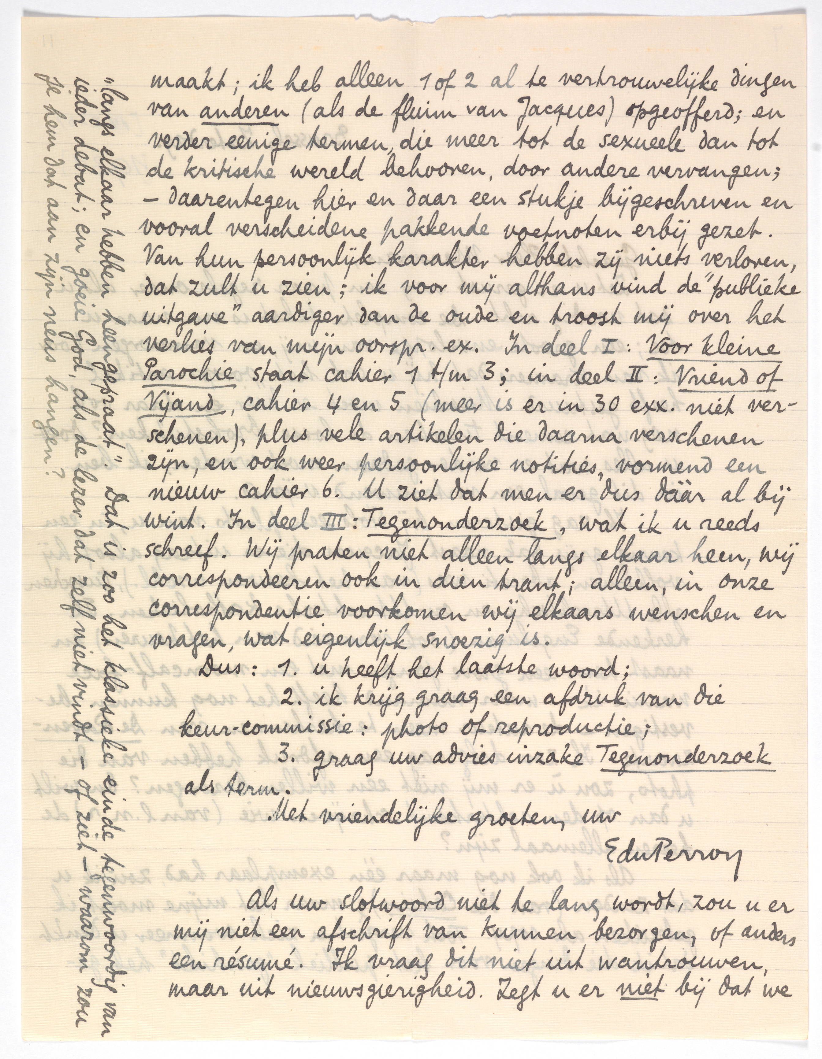 Als ik ook nog maar één exemplaar had, zou ik u dat zenden (van die Cahiers); maar het mijne moest ik gebruiken als copy. Toch vergist u zich wanneer u denkt dat ik die dingen voor het publiek ‘geschikt’ heb gemaakt; ik heb alleen 1 of 2 al te vertrouwelijke dingen van anderen (als de fluim van Jacques1553) opgeofferd; en verder eenige termen, die meer tot de sexueele dan tot de kritische wereld behooren, door andere vervangen1554; - daarentegen hier en daar een stukje bijgeschreven en vooral verscheidene pakkende voetnoten erbij gezet. Van hun persoonlijk karakter hebben zij niets verloren, dat zult u zien; ik voor mij althans vind de ‘publieke uitgave’ aardiger dan de oude en troost mij over het verlies van mijn oorspr. ex. In deel I: Voor kleine Parochie staat cahier 1 t/m 3; in deel II: Vriend of Vijand, cahier 4 en 5 (meer is er in 30 exx. niet verschenen), plus vele artikelen die daarna verschenen zijn, en ook weer persoonlijke notities, vormend een nieuw cahier 6. U ziet dat men er dus dààr al bij wint. In deel III: Tegenonderzoek, wat ik u reeds schreef. Wij praten niet alleen langs elkaar heen, wij correspondeeren ook in dien trant; alleen, in onze correspondentie voorkomen wij elkaars wenschen en vragen, wat eigenlijk snoezig is.