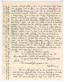 Zet u er gerust nog een paar regels onder als u dat noodig acht. De complete tekst is nu naar u toe; een groote enveloppe van mij, en vanmorgen hoor ik van Kramers dat hij u ook het ‘oorspr. artikel’ heeft gestuurd. Misschien moet er hier en daar ook nog wat cement tusschen de losse brokstukken? Doet u alles wat er verder gedaan moet worden, ik ben in dit geval een vertrouwend vijand.