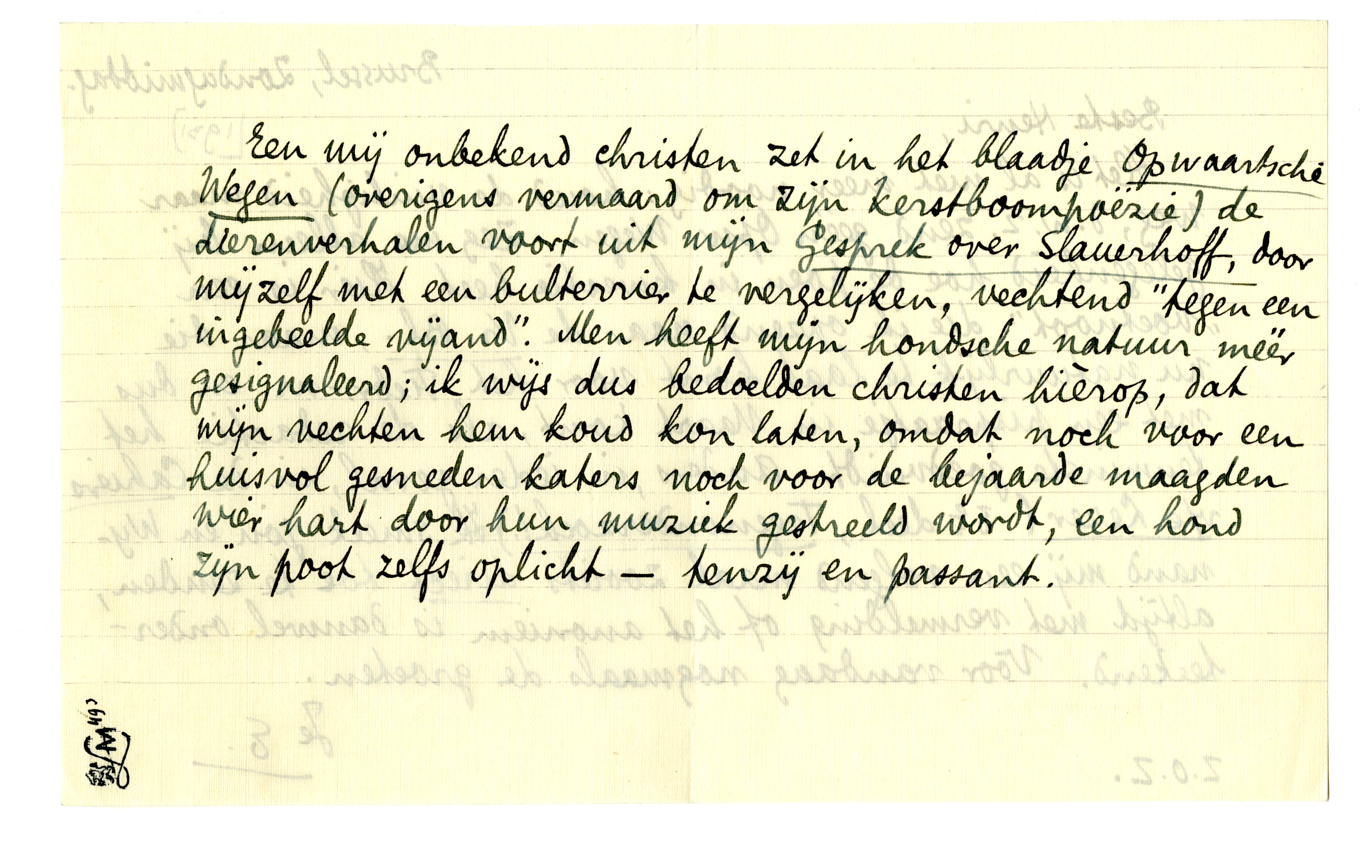 Een mij onbekend christen zet in het blaadje Opwaartsche Wegen (overigens vermaard om zijn kerstboompoëzie) de dierenverhalen voort uit mijn Gesprek over Slauerhoff, door mijzelf met een bulterrier te vergelijken, vechtend ‘tegen een ingebeelde vijand’. Men heeft mijn hondsche natuur méér gesignaleerd; ik wijs dus bedoelden christen hièrop, dat mijn vechten hem koud kon laten, omdat noch voor een huisvol gesneden katers noch voor de bejaarde maagden wier hart door hun muziek gestreeld wordt, een hond zijn poot zelfs oplicht - tenzij en passant.