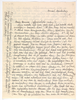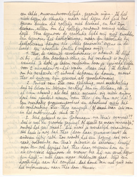 Er zal nog wel wat zijn, maar daarover later, als het je interesseert. Maar laat ik er nogmaals bij zeggen dat ik dikwijls met even groote ver-als be-wondering gezien heb hoe je de zaak met 2, 3 rake (ly-rische) zinnetjes weer op pooten zette. In ieder geval is het een heel curieus boek en in jouw ontwikkeling van wellicht het grootste belang. Maar je hebt gelijk: peuter hier maar niet te veel aan en begin liever over een tijdje aan geheel iets anders. De lyrische toon van het geheele verhaal is je fort; laat die dus zooveel mogelijk gelden en schrap, of bekort, alleen de zwakke plekken - en vul die eene gaping aan (na Vera's verraad). - Ik ben werkelijk benieuwd naar stuk III, omdat ik de rest nu nog zoo goed in het hoofd heb.