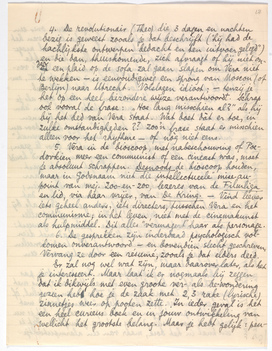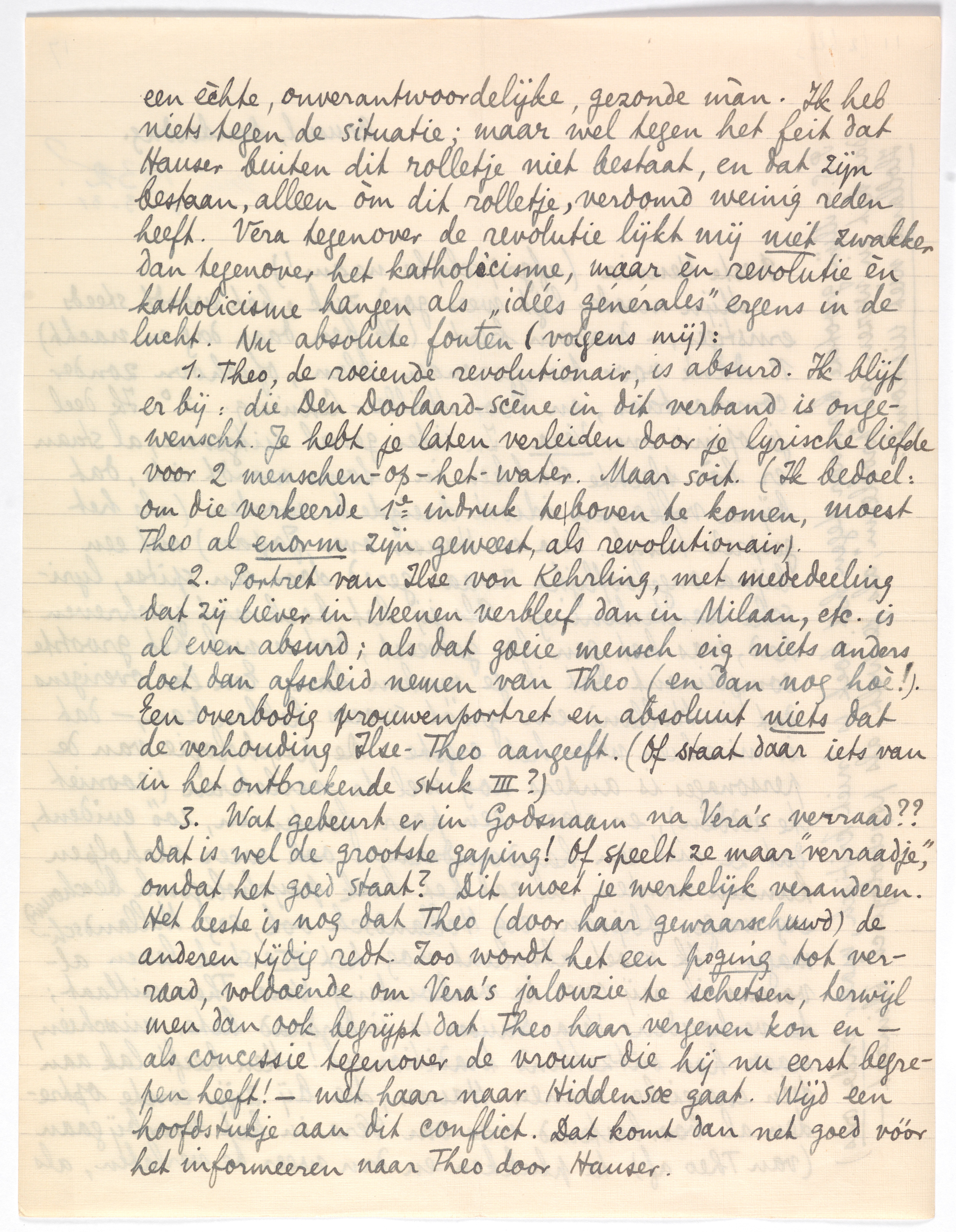 | 4. | De revolutionair (Theo) die 3 dagen en nachten bezig is geweest zooals je dat beschrijft (‘hij had de hachelijkste ontwerpen bedacht en ten uitvoer gelegd’) en die dan, thuiskomende, zich afvraagt of hij niet onder een plaid op de sofa zal gaan slapen om Vera niet te wekken - is eenvoudigweg een sprong van Moscou (of Berlijn) naar Utrecht. Volslagen idioot; - tenzij je het op een heel bizondere wijze verantwoordt. Schrap ook vooral de frase: ‘Hoe lang misschien al?’ als hij bij het bed van Vera staat. Wat doet dàt er toe, in zulke omstandigheden?? Zoo'n frase staat er misschien alleen voor het rhythme - of nòg niet eens. |