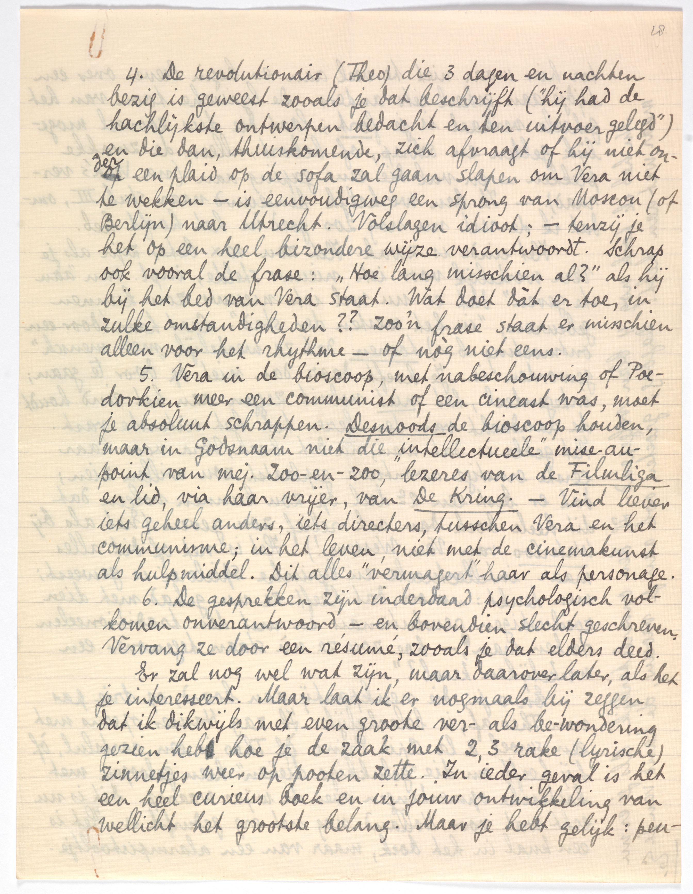| 5. | Vera in de bioscoop, met nabeschouwing of Poedovkien meer een communist of een cineast was, moet je absoluut schrappen. Desnoods de bioscoop houden, maar in Godsnaam niet die ‘intellectueele’ mise-au-point van mej. Zoo-en-zoo, ‘lezeres van de Filmliga en lid, via haar vrijer, van De Kring. - Vind liever iets geheel anders, iets directers, tusschen Vera en het communisme; in het leven, niet met de cinemakunst als hulpmiddel. Dit alles ‘vermagert’ haar als personage. |