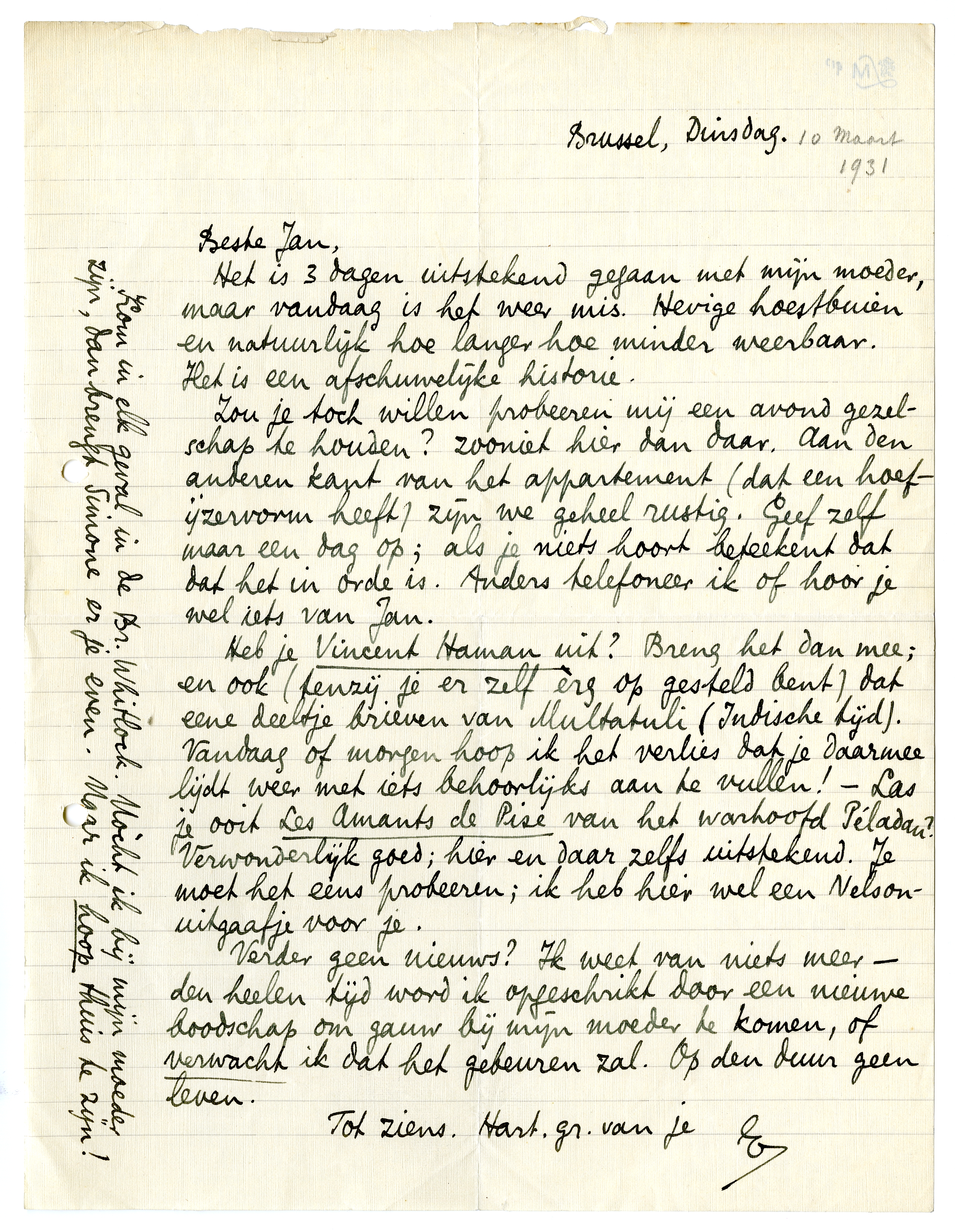 Heb je Vincent Haman uit? Breng het dan mee; en ook (tenzij je er zelf èrg op gesteld bent) dat eene deeltje brieven van Multatuli (Indische tijd). Vandaag of morgen hoop ik het verlies dat je daarmee lijdt weer met iets behoorlijks aan te vullen! - Las je ooit Les Amants de Pise van het warhoofd Péladan? Verwonderlijk goed; hier en daar zelfs uitstekend. Je moet het eens probeeren; ik heb hier wel een Nelsonuitgaafje voor je.