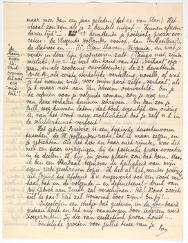 Dank voor de proeven,1629 die ik gisteren terugzond. Dit fragment behoort m.i. tot de beste stukken van het boek; vooral het portret van Vera is goed (en 10 × beter dan dat van Ilse). De theorieën van de revolutie zijn wat vaag, maar toch ook niet hinderlijk voor mijn gevoel, ze staan er tenminste niet in voor het genot van het opschrijven alleen, zooals - alweer - in het portret van Ilse. Ik raad je nogmaals aan dat portret te ‘versoberen’ op den definitieven tekst. Wat ben je toch een gekke kerel met je verhalen van ‘dat de boel nu zoo dood is dat je er geen jota meer in schrappen kunt’. Mag ik het dan voor je doen? (Je lijkt wel Jany!) - Met een paar wijzigingen, op één vrijen middag af te doen, heb je Vera belangrijk verbeterd; en zóó heilig en serieus is al deze literatuurfabrikatie toch niet? Je hoeft er niet eens voor te woekeren met je talent!1630