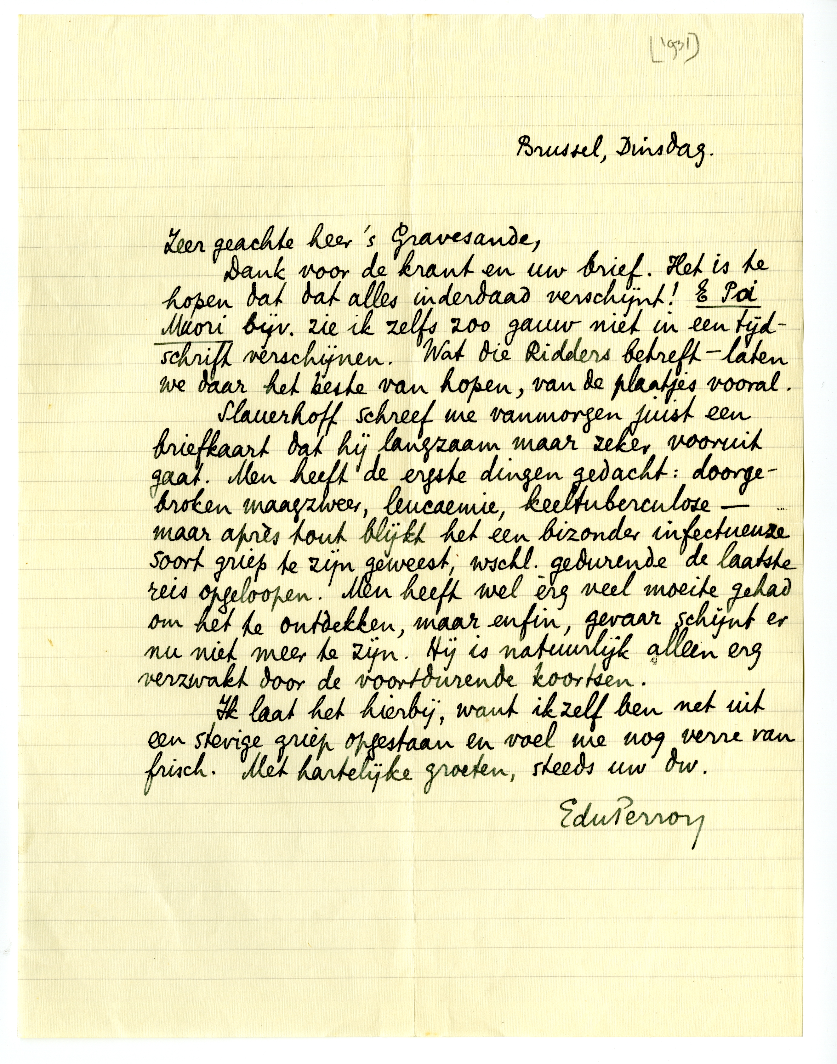 Dank voor de krant1633 en uw brief. Het is te hopen dat dat alles inderdaad verschijnt! E Poi Muori bijv. zie ik zelfs zoo gauw niet in een tijdschrift verschijnen. Wat die Ridders betreft - laten we daar het beste van hopen, van de plaatjes vooral.