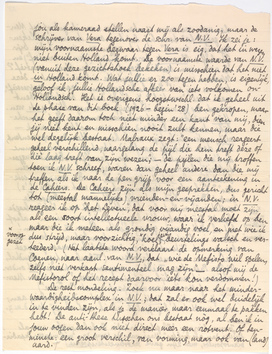 Je reactie op Nutt. Verzet doet mij zonderling aan; maar wordt toch begrijpelijk als ik niet als jij doe, d.w.z. jou als kameraad stellen naast mij als zoodanig, maar de schrijver van Vera tegenover de schr. van N.V. Ik zei je: mijn voornaamste bezwaar tegen Vera is eig. dat het in wezen niet buiten Holland komt. De voornaamste waarden van N.V. (vanuit deze gezichtshoek bekeken) is misschien dat het niet in Holland komt. Wat jullie er zoo tegen hebben, is eigenlijk, geloof ik, jullie Hollandsche afkeer van iets volkomen on-Hollandsch. Het is overigens hoogstwschl. dat ik geheel uit de phase van dit boek (1926-begin '28) ben gekropen, maar het geeft daarom toch niet minder een kant van mij, dien jij niet kent en misschien nooit zult kennen, maar die wel degelijk bestaat. Malraux zegt: ‘een mensch reageert geheel verschillend, naargelang de pijl die hem treft déze of diè laag treft van zijn wezen’; - de pijlen die mij troffen toen ik N.V. schreef, waren dan geheel andere dan die mij treffen als ik naar de pen grijp voor een aanteekening in de Cahiers. De Cahiers zijn als mijn gesprekken, dus gericht tot (meestal mannelijke) vrienden-en-vijanden; in N.V. reageer ik op ‘het Leven’, dat voor mij meestal moet zijn als een soort intellectueele vrouw, waar ik verliefd op ben maar die ik meteen als grondig vijandig voel, en met wie ik dus strijd, maar voorzichtig,* koel; en beurtelings valsch en verteederd. (Het laatste woord verklaart de opmerking van Coenen,1642 naar aanl. van N.V., dat ‘wie de Mefisto wil spelen, zelfs niet verkapt sentimenteel mag zijn’ - alsof mij de Mefistorol of het recept daarvoor ièts kon verdommen!)