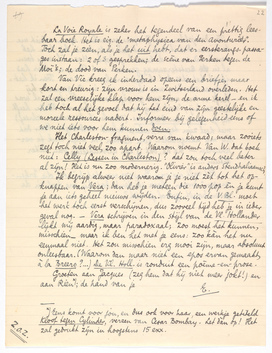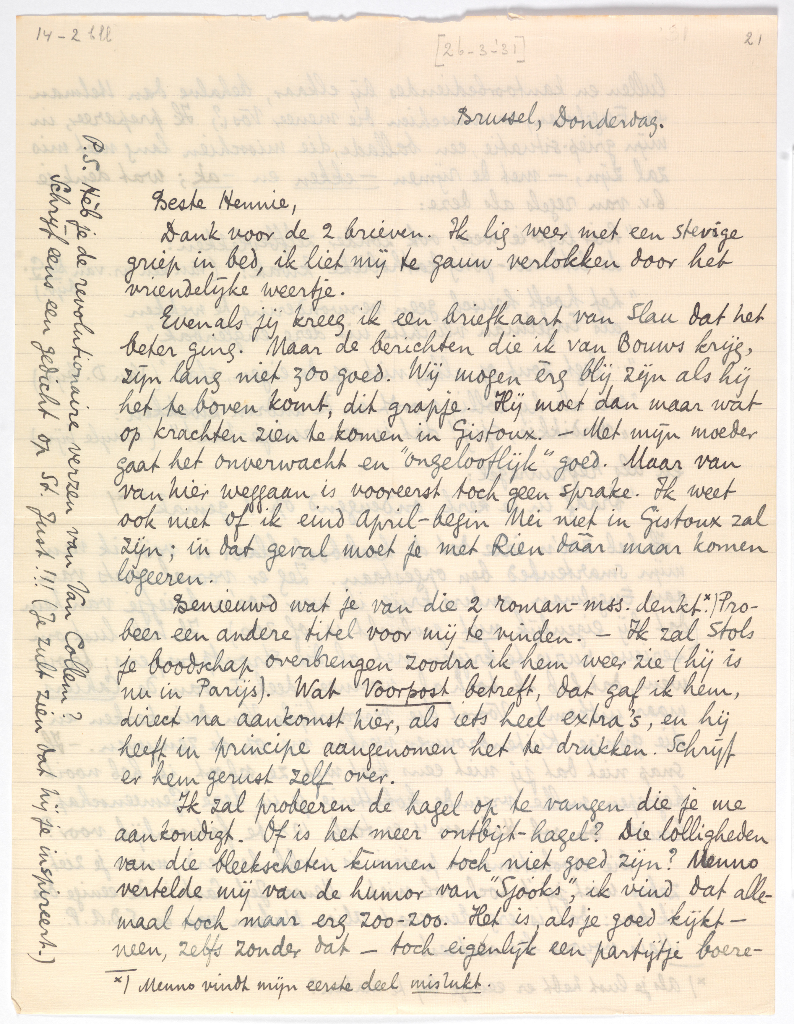 Benieuwd wat je van die 2 roman-mss. denkt.* Probeer een andere titel voor mij te vinden. - Ik zal Stols je boodschap overbrengen zoodra ik hem weer zie (hij is nu in Parijs). Wat Voorpost betreft, dat gaf ik hem, direct na aankomst hier, als iets heel extra's, en hij heeft in principe aangenomen het te drukken. Schrijf er hem gerust zelf over.