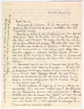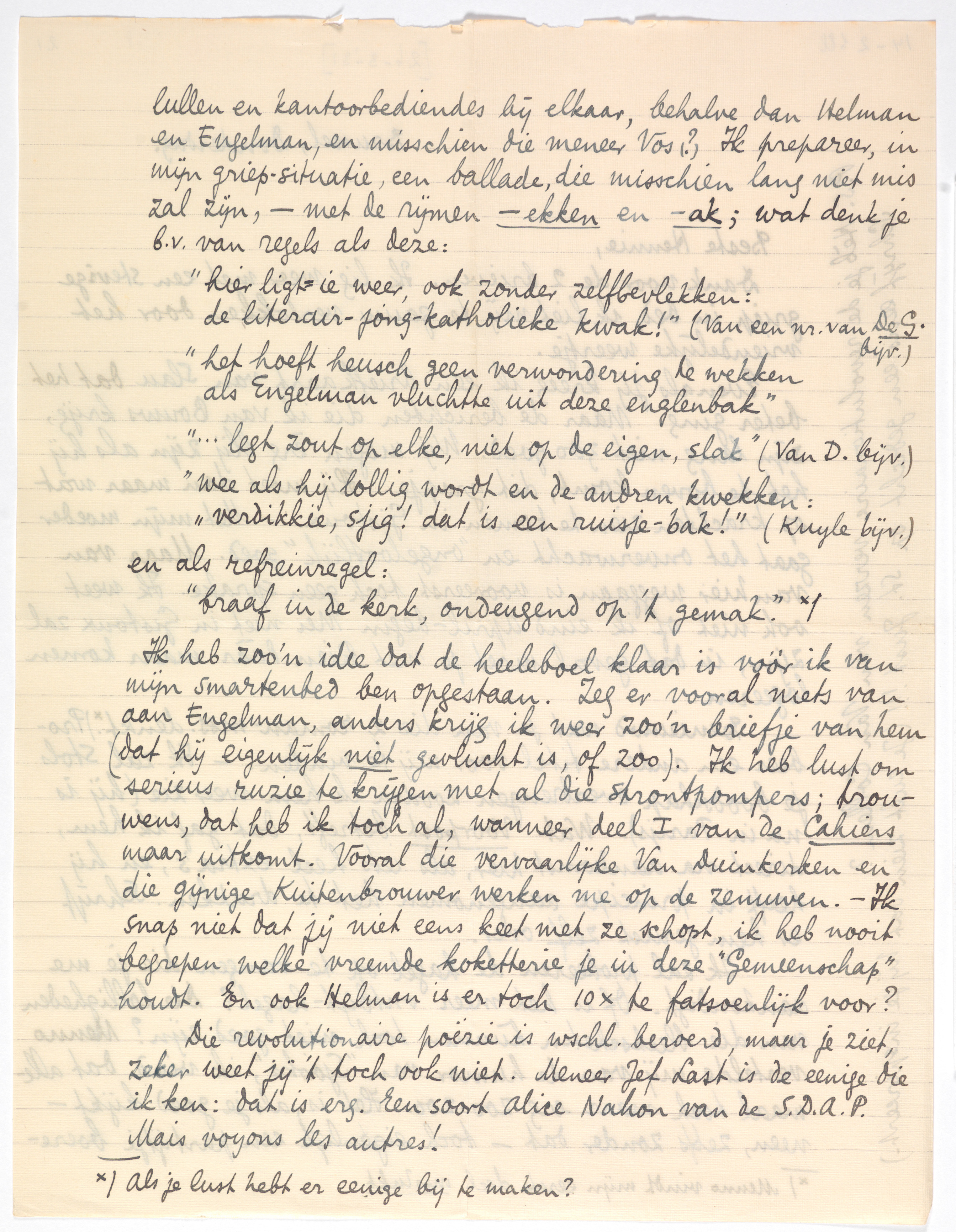 Ik heb zoo'n idee dat de heeleboel klaar is vóór ik van mijn smartenbed ben opgestaan. Zeg er vooral niets van aan Engelman, anders krijg ik weer zoo'n briefje van hem (dat hij eigenlijk niet gevlucht is, of zoo). Ik heb lust om serieus ruzie te krijgen met al die stront-pompers; trouwens, dat heb ik toch al, wanneer deel I van de Cahiers maar uitkomt. Vooral die vervaarlijke Van Duinkerken en die gijnige Kuitenbrouwer werken me op de zenuwen. - Ik snap niet dat jij niet eens keet met ze schopt, ik heb nooit begrepen welke vreemde koketterie je in deze ‘Gemeenschap’ houdt. En ook Helman is er toch 10 × te fatsoenlijk voor?