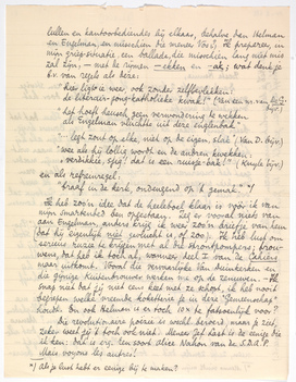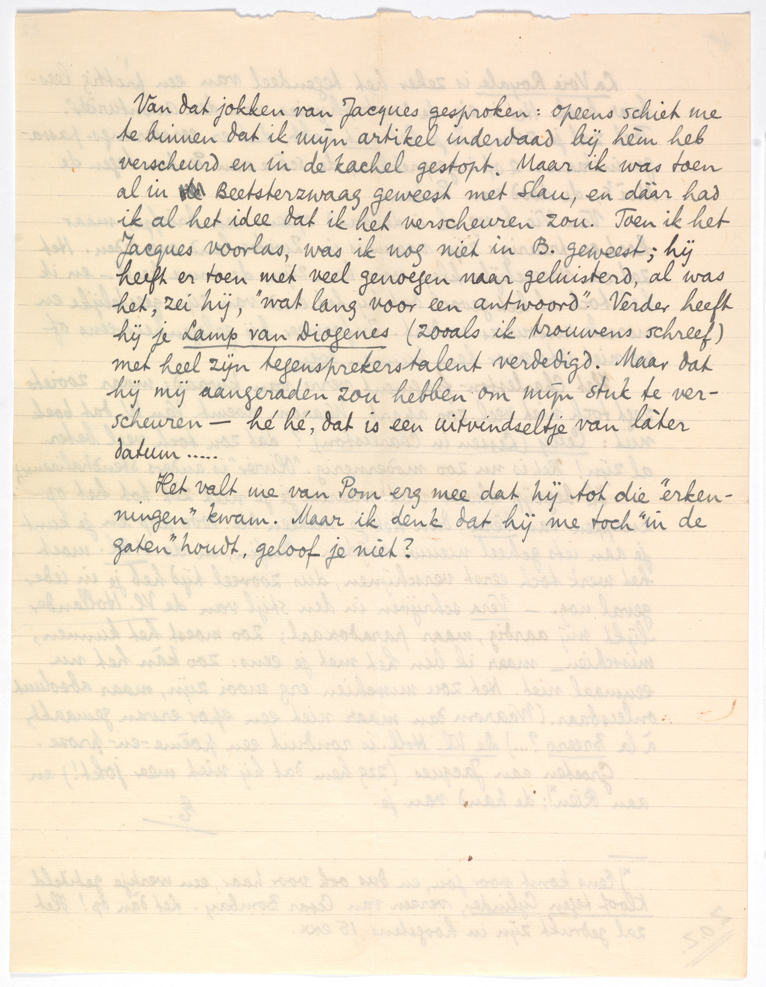 Van dat jokken van Jacques gesproken: opeens schiet me te binnen dat ik mijn artikel inderdaad bij hèm heb verscheurd en in de kachel gestopt.1648 Maar ik was toen al in Beetsterzwaag geweest met Slau, en dààr had ik al het idee dat ik het verscheuren zou. Toen ik het Jacques voorlas, was ik nog niet in B. geweest; hij heeft er toen met veel genoegen naar geluisterd, al was het, zei hij, ‘wat lang voor een antwoord’. Verder heeft hij je Lamp van Diogenes (zooals ik trouwens schreef) met heel zijn tegensprekerstalent verdedigd. Maar dat hij mij aangeraden zou hebben om mijn stuk te verscheuren - hé hé, dat is een uitvindseltje van làter datum......
