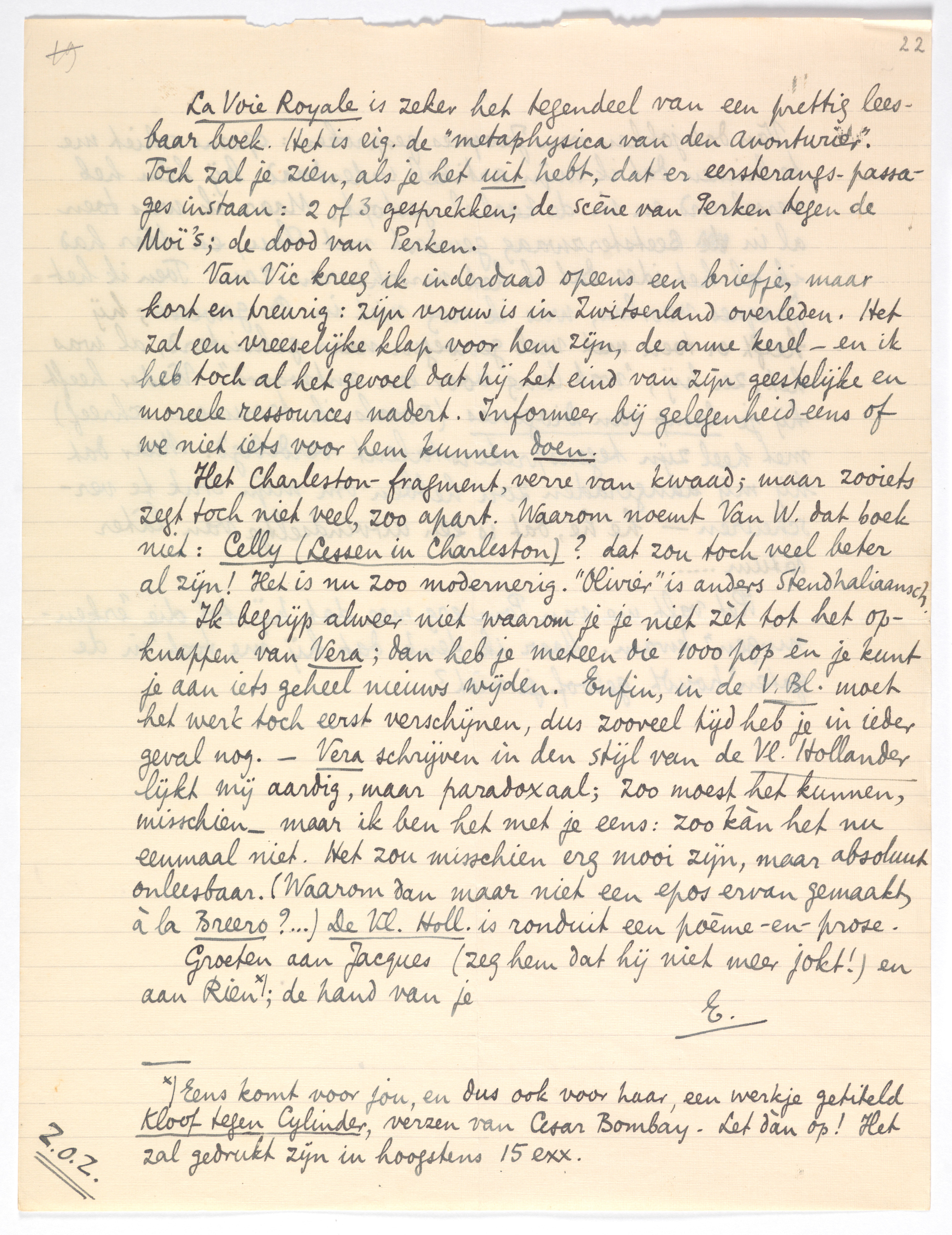 La Voie Royale is zeker het tegendeel van een prettig leesbaar boek. Het is eig. de ‘metaphysica van den Avonturier’. Toch zal je zien, als je het uit hebt, dat er eersterangs- passages instaan: 2 of 3 gesprekken; de scène van Perken tegen de Moï's; de dood van Perken.
