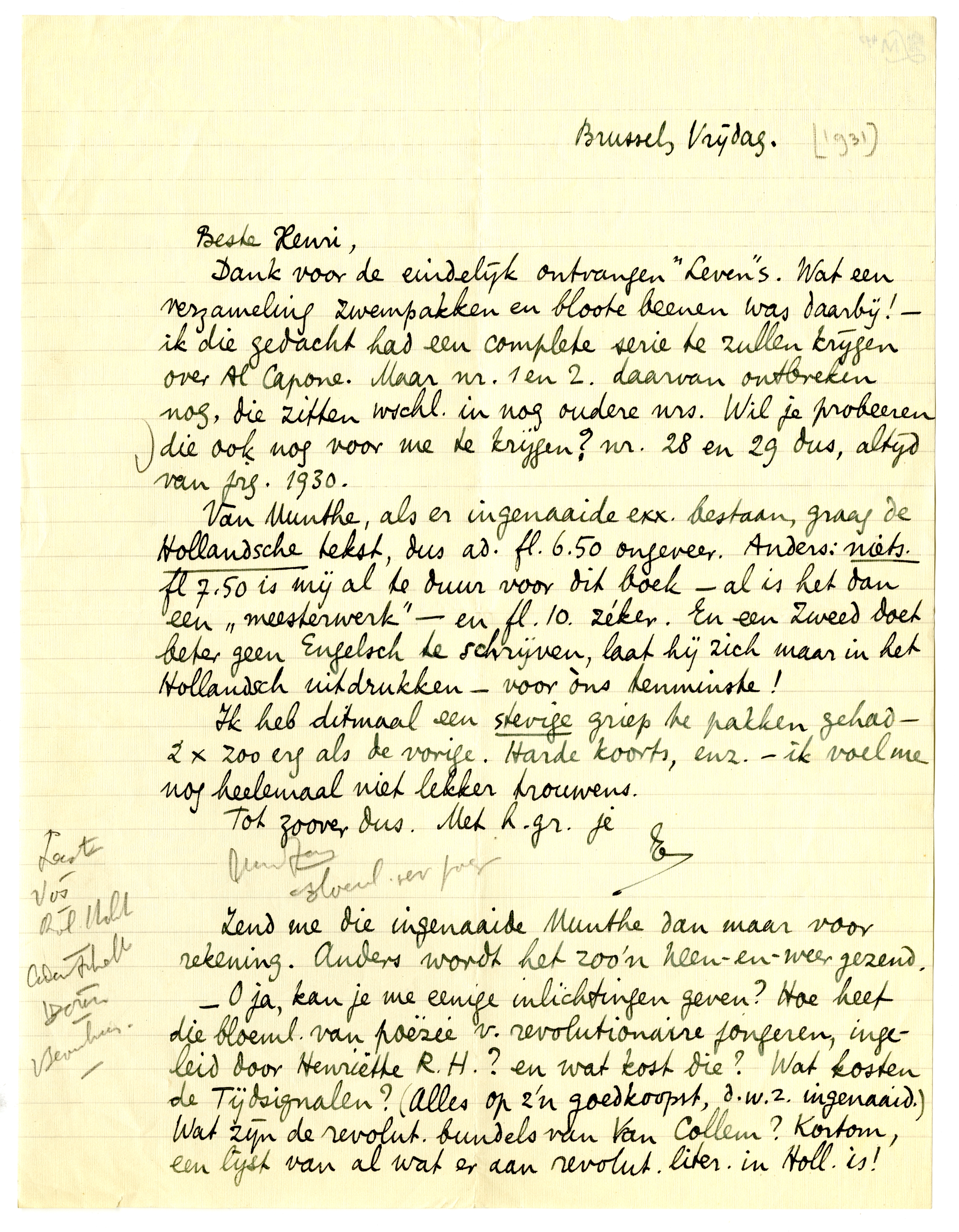 - O ja, kan je me eenige inlichtingen geven? Hoe heet die bloeml. van poëzie v. revolutionaire jongeren, ingeleid door Henriëtte R.H.? en wat kost die? Wat kosten de Tijdsignalen1651? (Alles op z'n goedkoopst, d.w.z. ingenaaid.) Wat zijn de revolut. bundels van Van Collem? Kortom, een lijst van al wat er aan revolut. liter. in Holl. is!