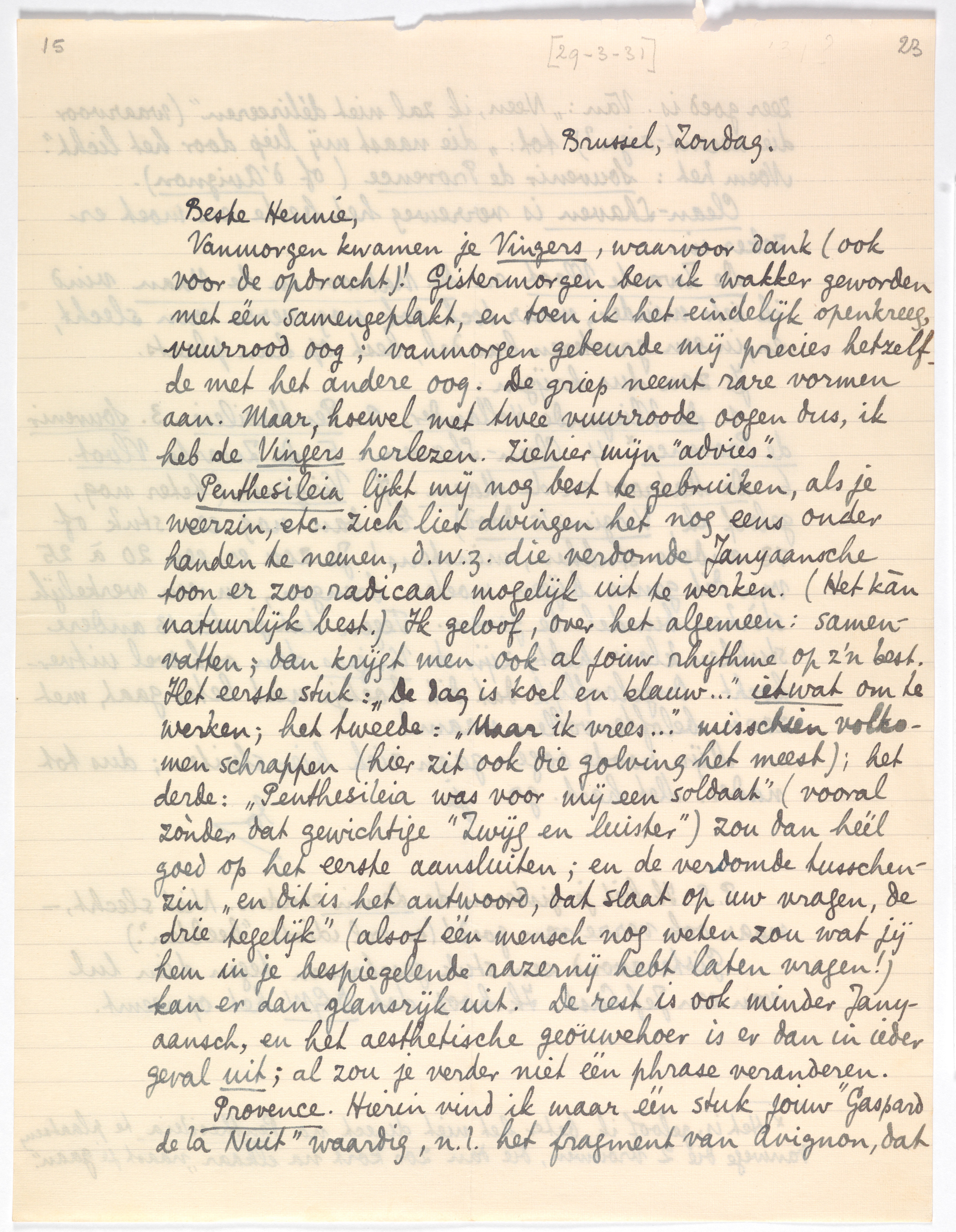 Provence. Hierin vind ik maar één stuk jouw ‘Gaspard de la Nuit’ waardig, n.l. het fragment van Avignon, dat zeer goed is. Van: ‘Neen, ik zal niet délireeren’ (waarvoor die accent-aigu?) tot: ‘die naast mij liep door het licht’. Noem het: Souvenir de Provence (of d'Avignon).