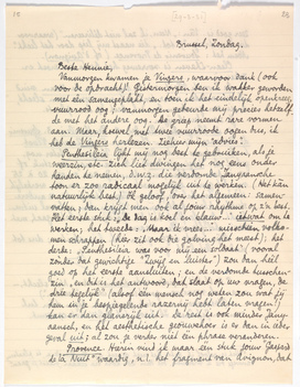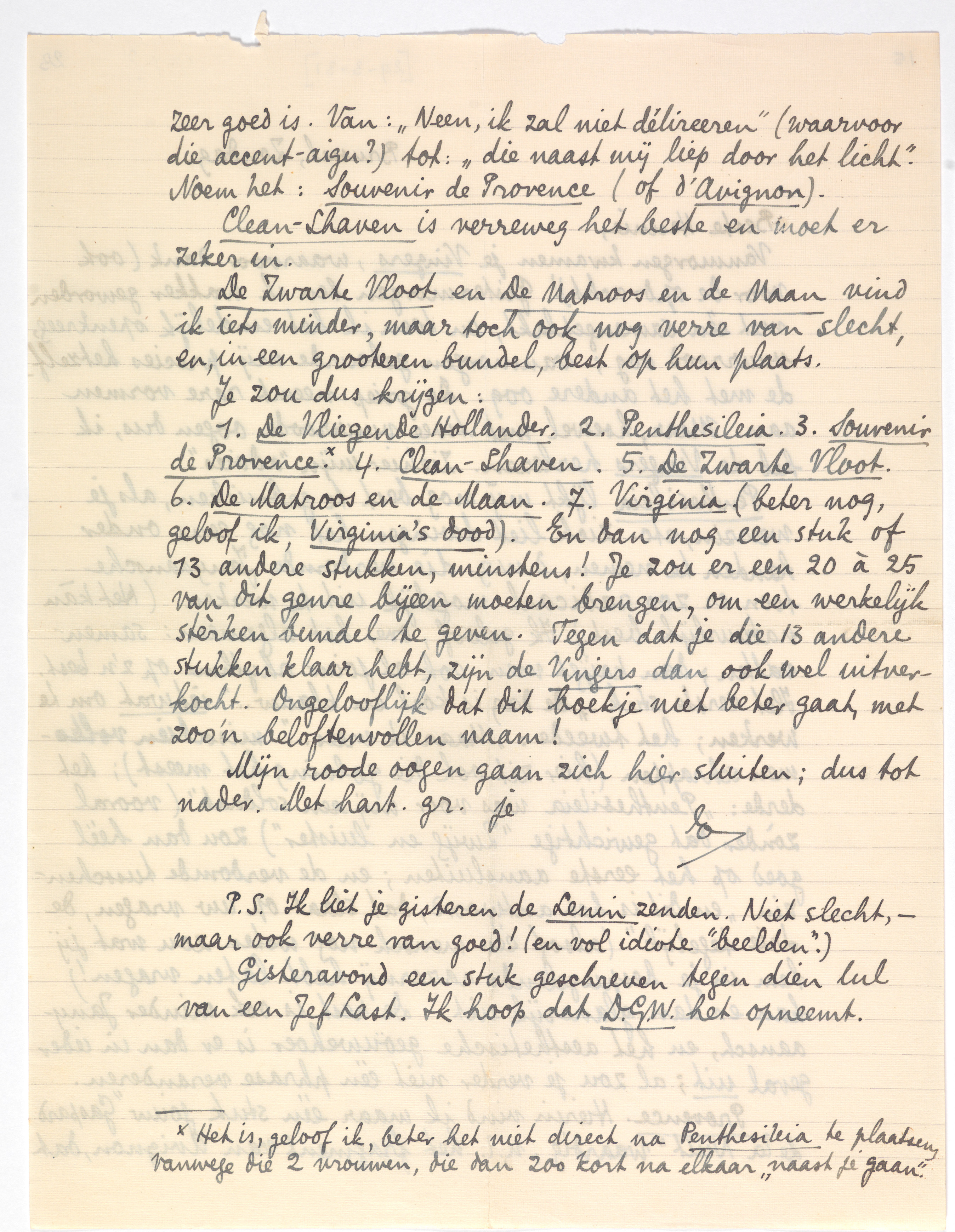 Penthesileia lijkt mij nog best te gebruiken, als je weerzin, etc. zich liet dwingen het nog eens onder handen te nemen, d.w.z. die verdomde Janyaansche toon er zoo radicaal mogelijk uit te werken. (Het kàn natuurlijk best.) Ik geloof, over het algemeen: samenvatten; dan krijgt men ook al jouw rhythme op z'n best. Het eerste stuk: ‘De dag is koel en blauw...’ ietwat om te werken; het tweede: ‘Maar ik vrees...’ misschien volkomen schrappen (hier zit ook die golving het meest); het derde: ‘Penthesileia was voor mij een soldaat’ (vooral zònder dat gewichtige ‘Zwijg en luister’) zou dan héél goed op het eerste aansluiten; en de verdomde tusschenzin ‘en dit is het antwoord, dat slaat op uw vragen, de drie tegelijk’ (alsof één mensch nog weten zou wat jij hem in je bespiegelende razernij hebt laten vragen!) kan er dan glansrijk uit. De rest is ook minder Janyaansch, en het aesthetische geouwehoer is er dan in ieder geval uit; al zou je verder niet één phrase veranderen.
