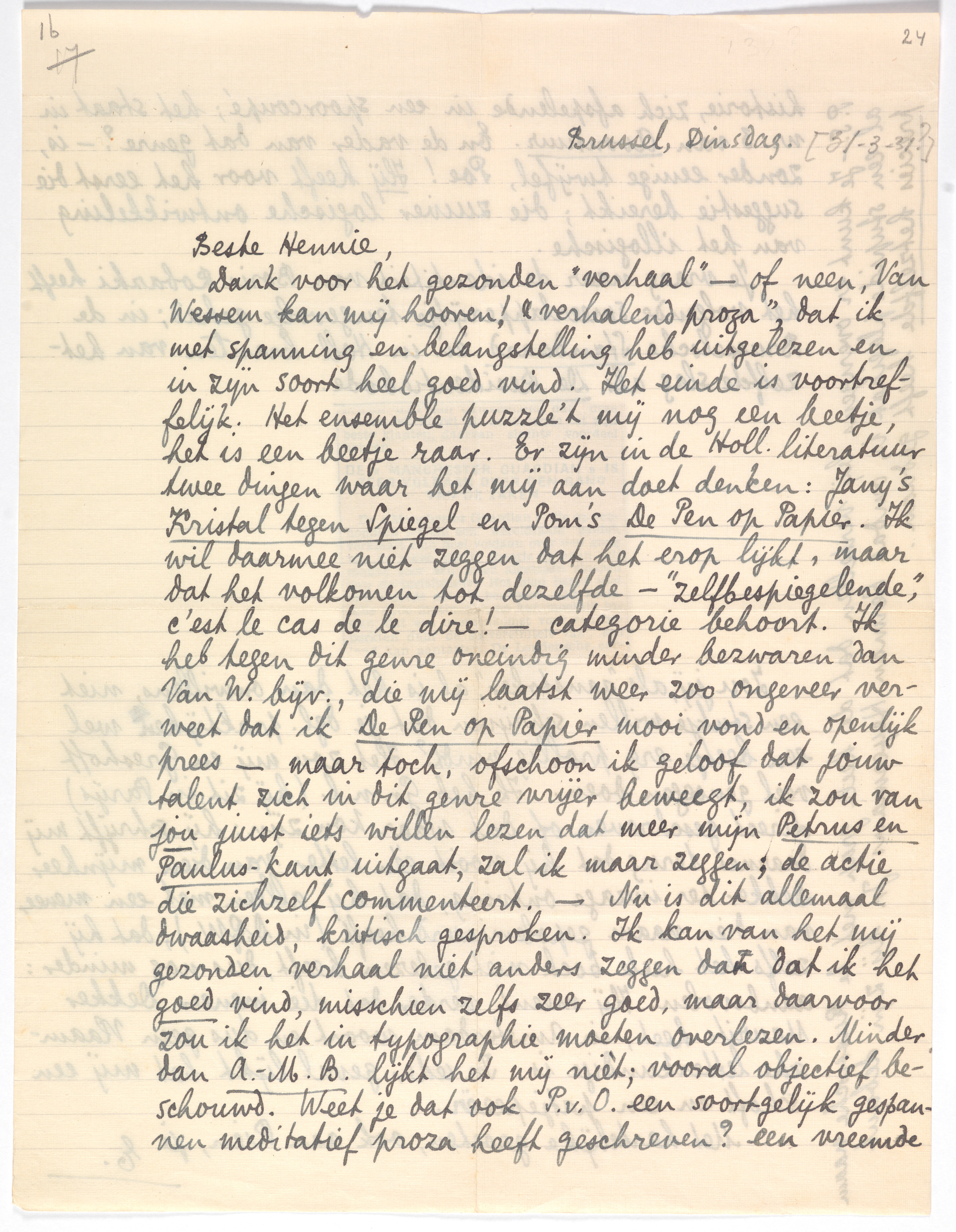 Dank voor het gezonden ‘verhaal’1657 - of neen, Van Wessem kan mij hooren! ‘verhalend proza’, dat ik met spanning en belangstelling heb uitgelezen en in zijn soort heel goed vind. Het einde is voortreffelijk. Het ensemble puzzle't mij nog een beetje, het is een beetje raar. Er zijn in de Holl. literatuur twee dingen waar het mij aan doet denken: Jany's Kristal tegen Spiegel en Pom's De Pen op Papier. Ik wil daarmee niet zeggen dat het erop lijkt, maar dat het volkomen tot dezelfde - ‘zelfbespiegelende’, c'est le cas de le dire! - categorie behoort. Ik heb tegen dit genre oneindig minder bezwaren dan Van W. bijv., die mij laatst weer zoo ongeveer verweet dat ik De Pen op Papier mooi vond en openlijk prees-maar toch, ofschoon ik geloof dat jouw talent zich in dit genre vrijer beweegt, ik zou van jou juist iets willen lezen dat meer mijn Petrus en Paulus-kant uitgaat, zal ik maar zeggen; de actie die zichzelf commenteert.-Nu is dit allemaal dwaasheid, kritisch gesproken. Ik kan van het mij gezonden verhaal niet anders zeggen dan dat ik het goed vind, misschien zelfs zeer goed, maar daarvoor zou ik het in typographic moeten overlezen. Minder dan A.-M.B. lijkt het mij nièt; vooral objectief beschouwd. Weet je dat ook P.v.O. een soortgelijk gespannen meditatief proza heeft geschreven? een vreemde historie, zich afspelende in een spoorcoupé; het staat in nr. 3 van Avontuur.1658 En de vader van dat genre?-is, zonder eenige twijfel, Poe! Hij heeft voor het eerst die suggestie bereikt; die zuiver logische ontwikkeling van het illogische.