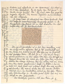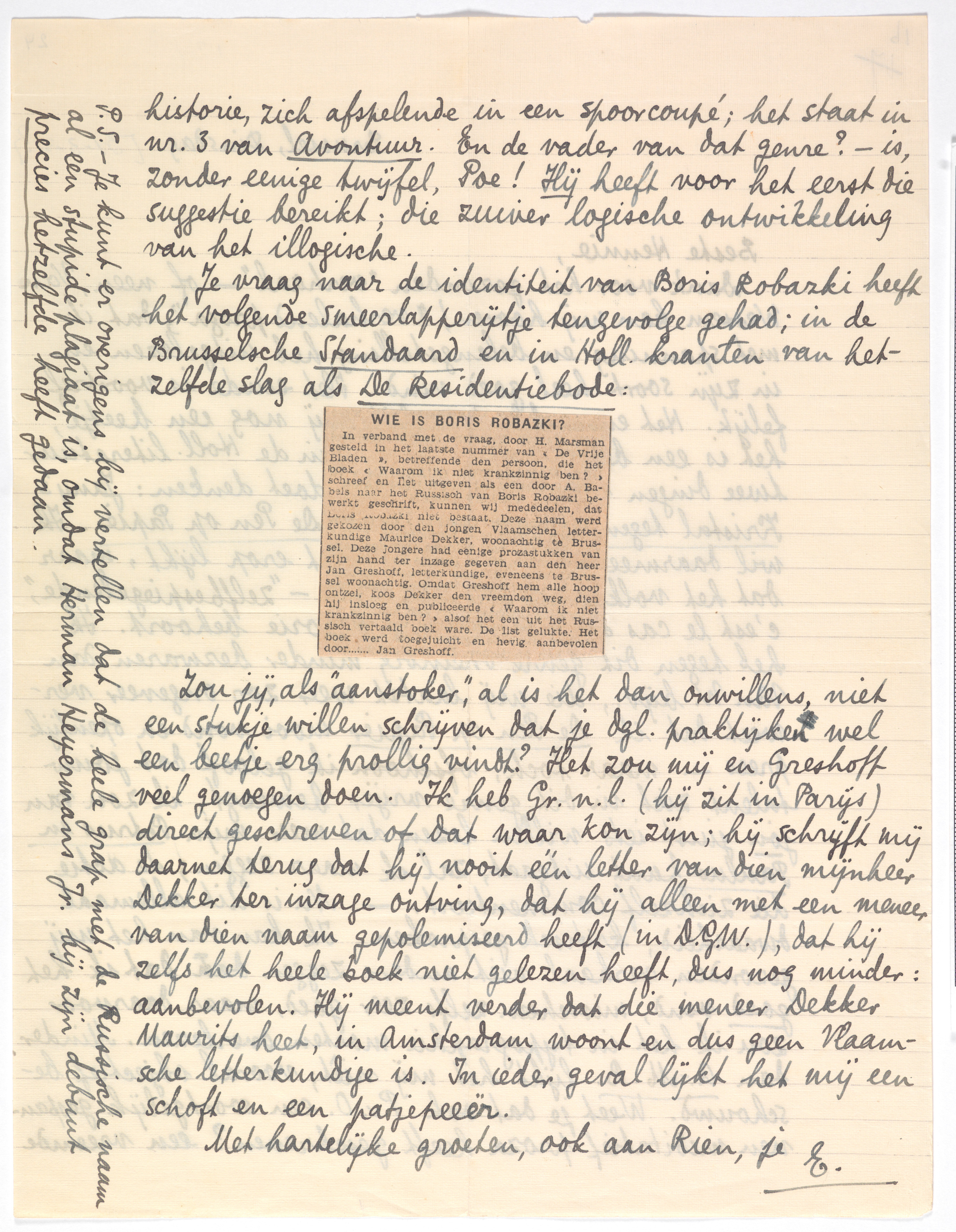Zou jij, als ‘aanstoker’, al is het dan onwillens, niet een stukje willen schrijven dat je dgl. praktijken wel een beetje erg prollig vindt? Het zou mij en Greshoff veel genoegen doen. Ik heb Gr. n.l. (hij zit in Parijs) direct geschreven of dat waar kon zijn; hij schrijft mij daarnet terug dat hij nooit één letter van dien mijnheer Dekker ter inzage ontving, dat hij alleen met een meneer van dien naam gepolemiseerd heeft (in D.G.W.), dat hij zelfs het heele boek niet gelezen heeft, dus nog minder: aanbevolen. Hij meent verder dat die meneer Dekker Maurits heet, in Amsterdam woont en dus geen Vlaamsche letterkundige is. In ieder geval lijkt het mij een schoft en een patjepeeër. Met hartelijke groeten, ook aan Rien, je