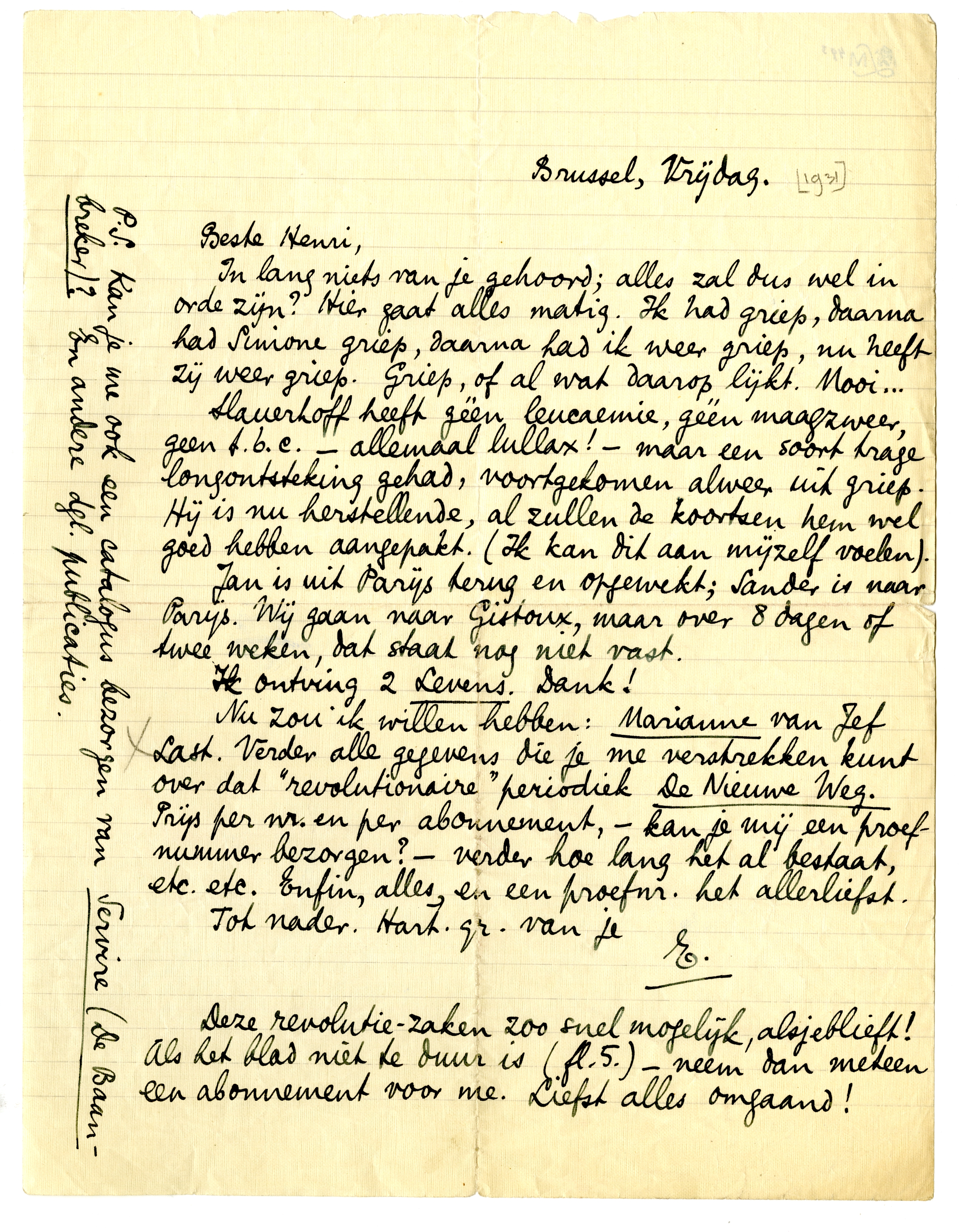 Nu zou ik willen hebben: Marianne van Jef Last. Verder alle gegevens die je me verstrekken kunt over dat ‘revolutionaire’ periodiek De Nieuwe Weg. Prijs per nr. en per abonnement, - kan je mij een proefnummer bezorgen? - verder hoe lang het al bestaat, etc. etc. Enfin, alles, en een proefnr. het allerliefst.