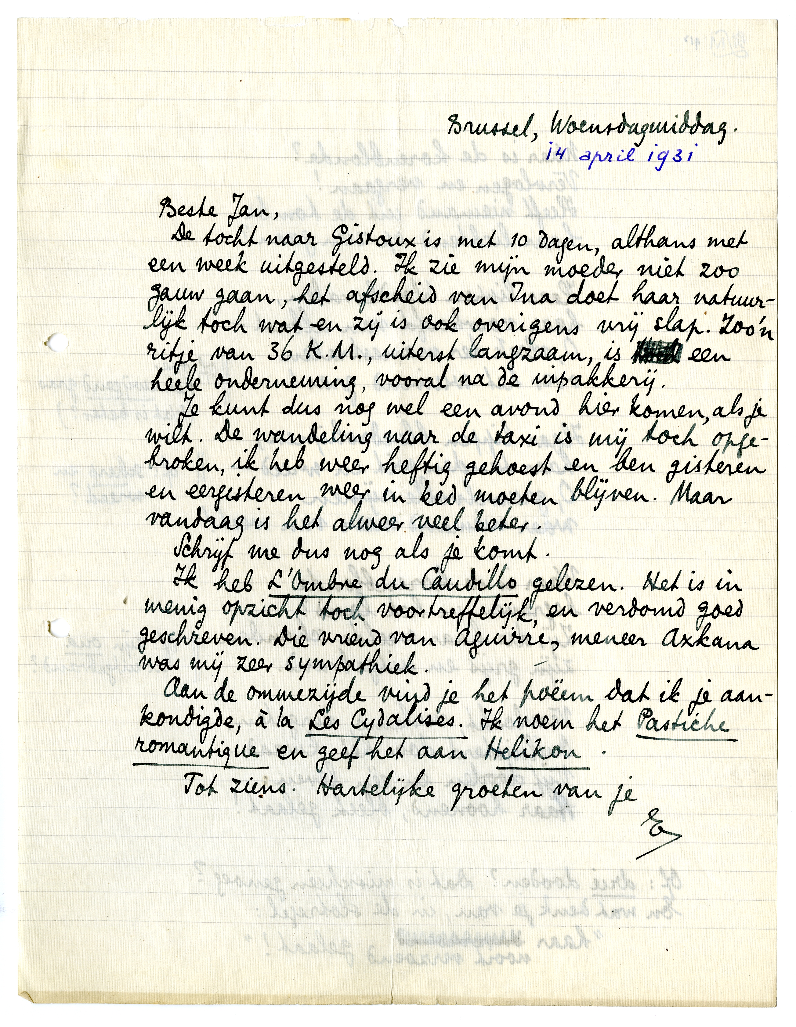 De tocht naar Gistoux is met 10 dagen, althans met een week uitgesteld. Ik zie mijn moeder niet zoo gauw gaan, het afscheid van Ina doet haar natuurlijk toch wat en zij is ook overigens vrij slap. Zoo'n ritje van 36 K.M., uiterst langzaam, is een heele onderneming, vooral na de inpakkerij.