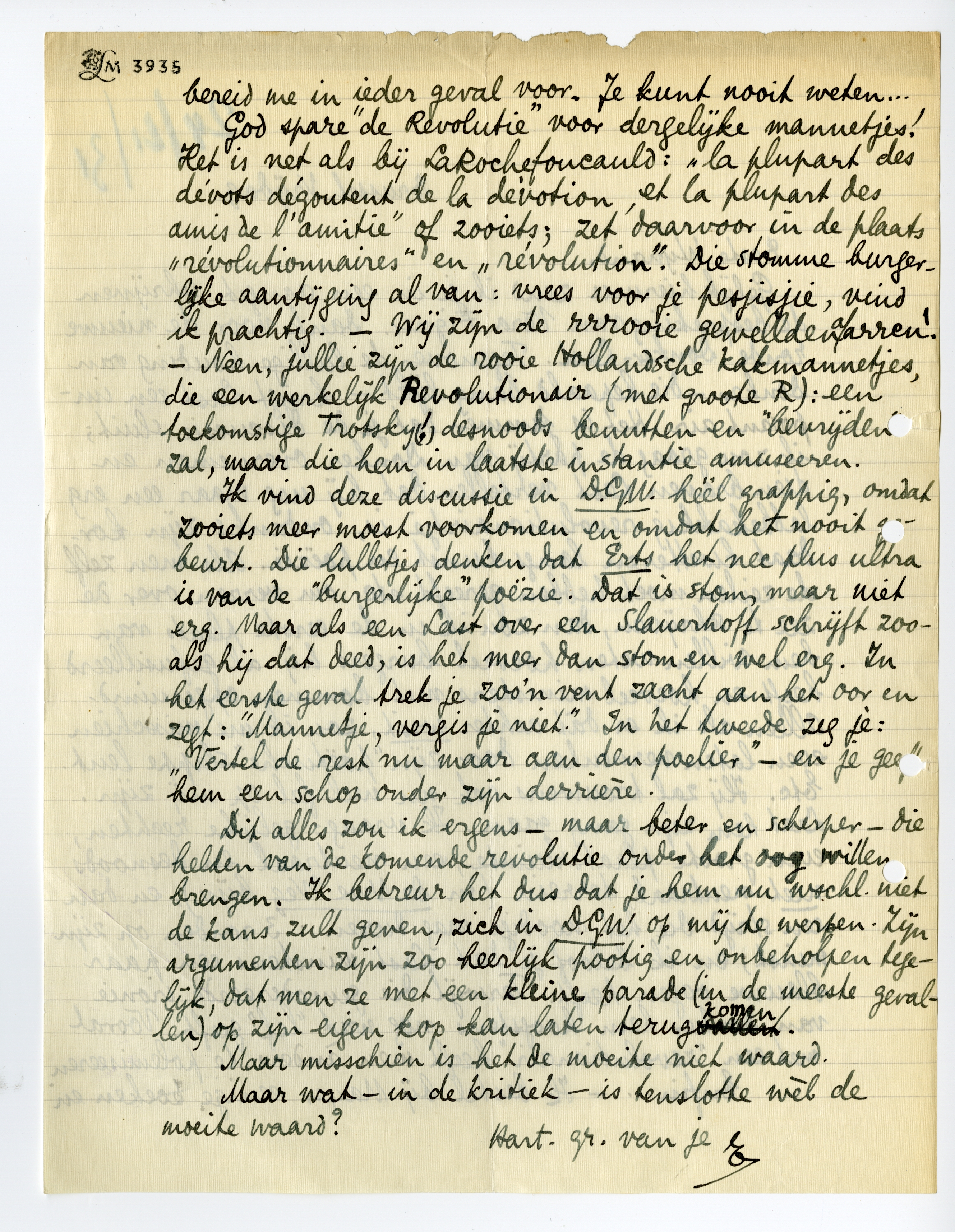 Dit alles zou ik ergens - maar beter en scherper - die helden van de komende revolutie onder het oog willen brengen. Ik betreur het dus dat je hem nu wschl. niet de kans zult geven, zich in D.G.W. op mij te werpen. Zijn argumenten zijn zoo heerlijk pootig en onbeholpen tegelijk, dat men ze met een kleine parade (in de meeste gevallen) op zijn eigen kop kan laten terugkomen.
